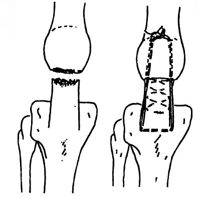 В литературе обсуждаются и вопросы техники выполнения таких операций. F. Е. West, R. Soto-Hall [20] рекомендуют производить пателлэктомию через поперечный разрез с пластикой разгибательного аппарата путем перемещения внутренней широкой мышцы. Аналогичную технику, но с использованием косого разреза сухожильного растяжения применяли G. Blatter и соавт. [3]. F. J. Funk [6], T. D Sisk [15] после пателлэктомии дополнительно накладывали проволочную петлю, проведенную через прямую головку ЧГМ и связку надколенника, а Н. В. Shorbe, С. Н. Dobson [14] использовали для укрепления шва треугольный лоскут на дистальной ножке из сухожилия прямой головки по Codivilla.