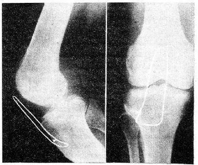 Такую «защищенную» пателлэктомию мы произвели у 3 больных. На рис. 4 показано расположение блокирующей проволочной петли.