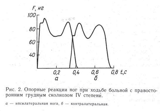 Вероятно, своеобразное расположение масс туловища у больных сколиозом должно отразиться на реализации опорных толчков ног — основного элемента другого жизненно важного акта человека — ходьбы.