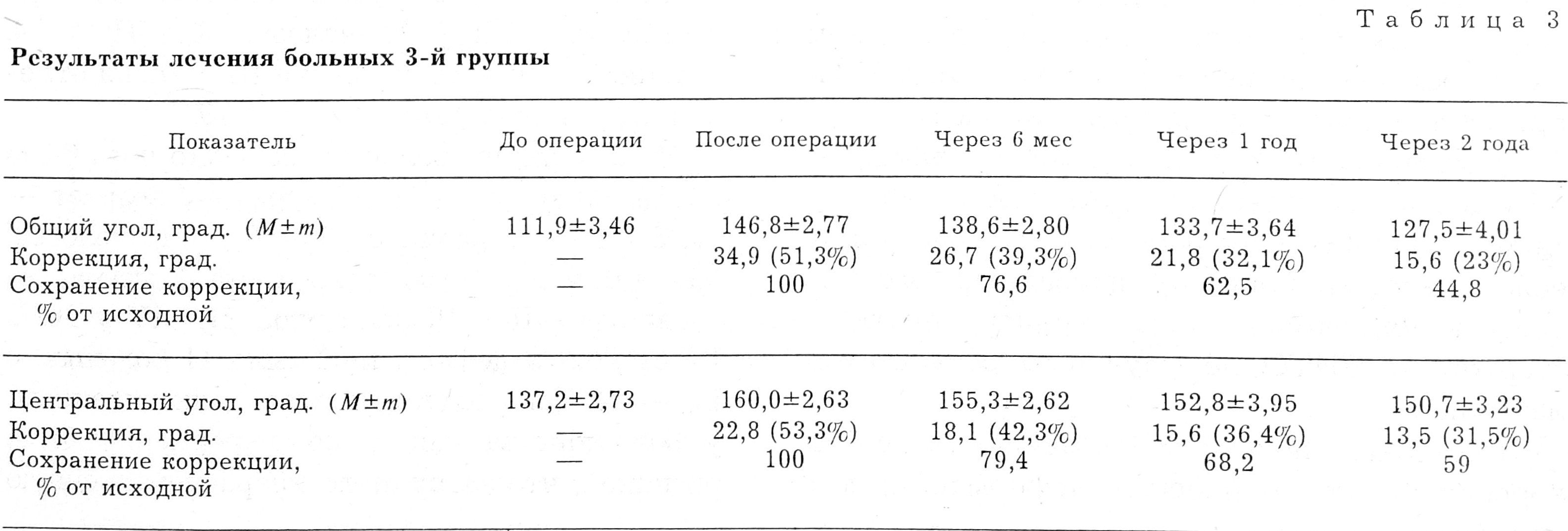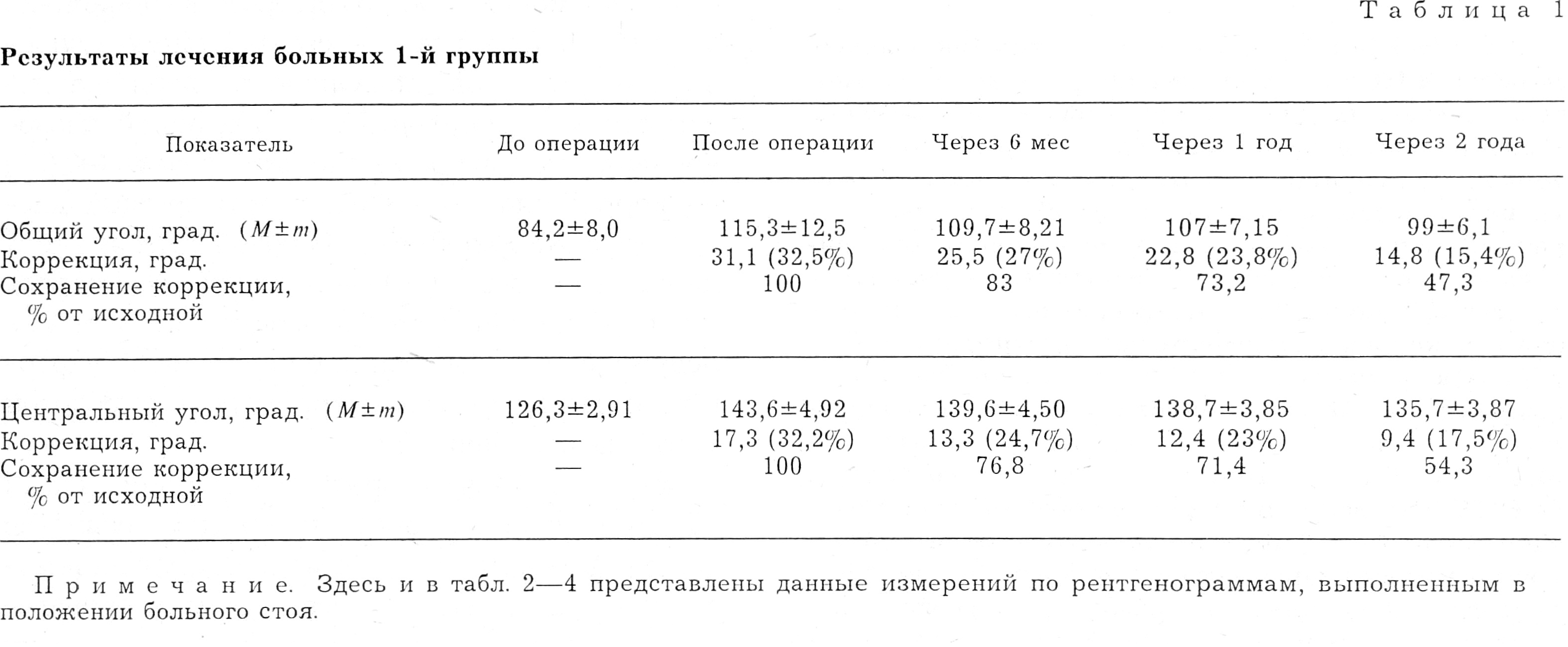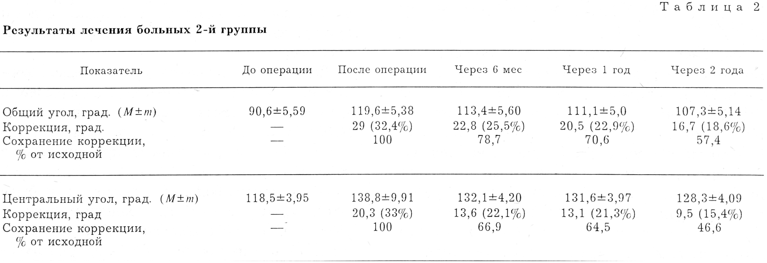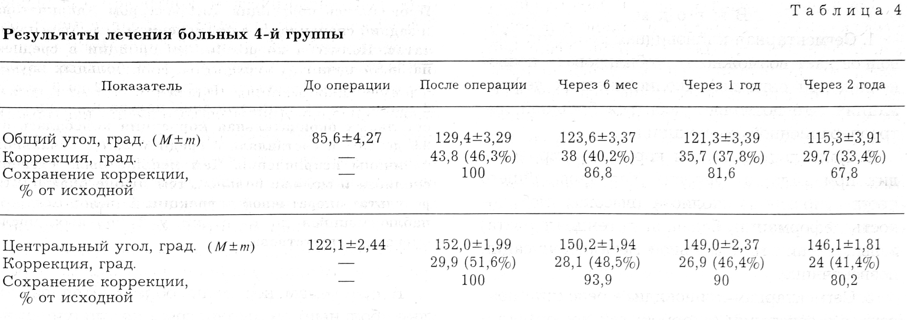 Динамику сохранения хирургической коррекции изучали на основе измерения общего и центрального углов деформации по методу Кобба в разные сроки после операции (до 2 лет). Полученные данные представлены в табл. 1—4.