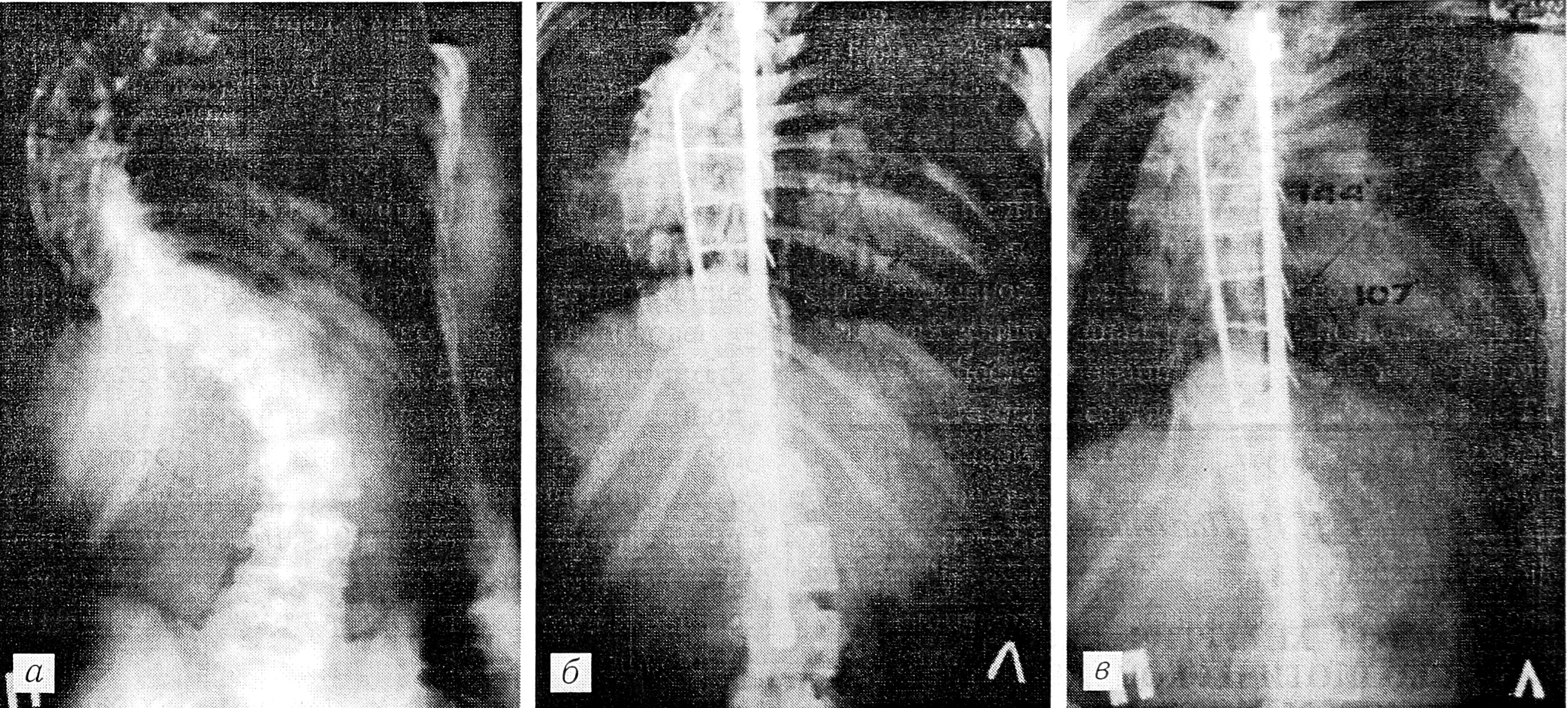 Рентгенограммы больной С. 14 лет. Диагноз: диспластический правосторонний грудной сколиоз IV степени. Произведены: сегментарная клиновидная резекция тел позвонков на вершине искривления, коррекция и фиксация позвоночника дистрактором Харрингтона с боковой тягой.