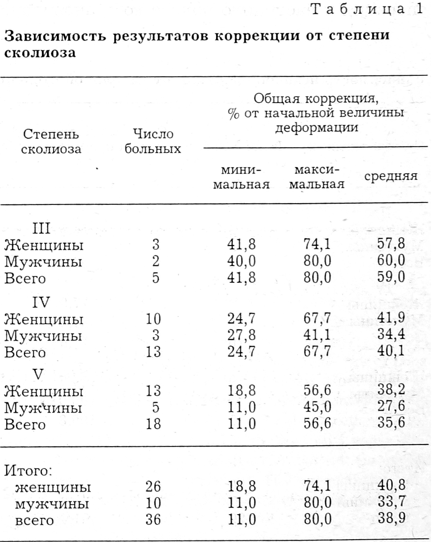 Величина достигнутой во время операции коррекции колебалась от 11 до 80% начальной величины искривления (в среднем 38,9%). У 6 больных она превышала 50%, у 16 составляла от 41 до 50%, у 8 — от 31 до 40%, у 4 — от 21 до 30% и у 2 — от 11 до 20%. С увеличением начальной степени сколиоза величина достигаемой при операции коррекции уменьшалась (табл. 1). Так, у больных со сколиозом III степени общая коррекция составила в среднем 59% начальной величины искривления, IV степени — 40,1%, V степени — 35,6%. Однако у отдельных больных со сколиозом IV—V степени достигалась коррекция свыше 50%.