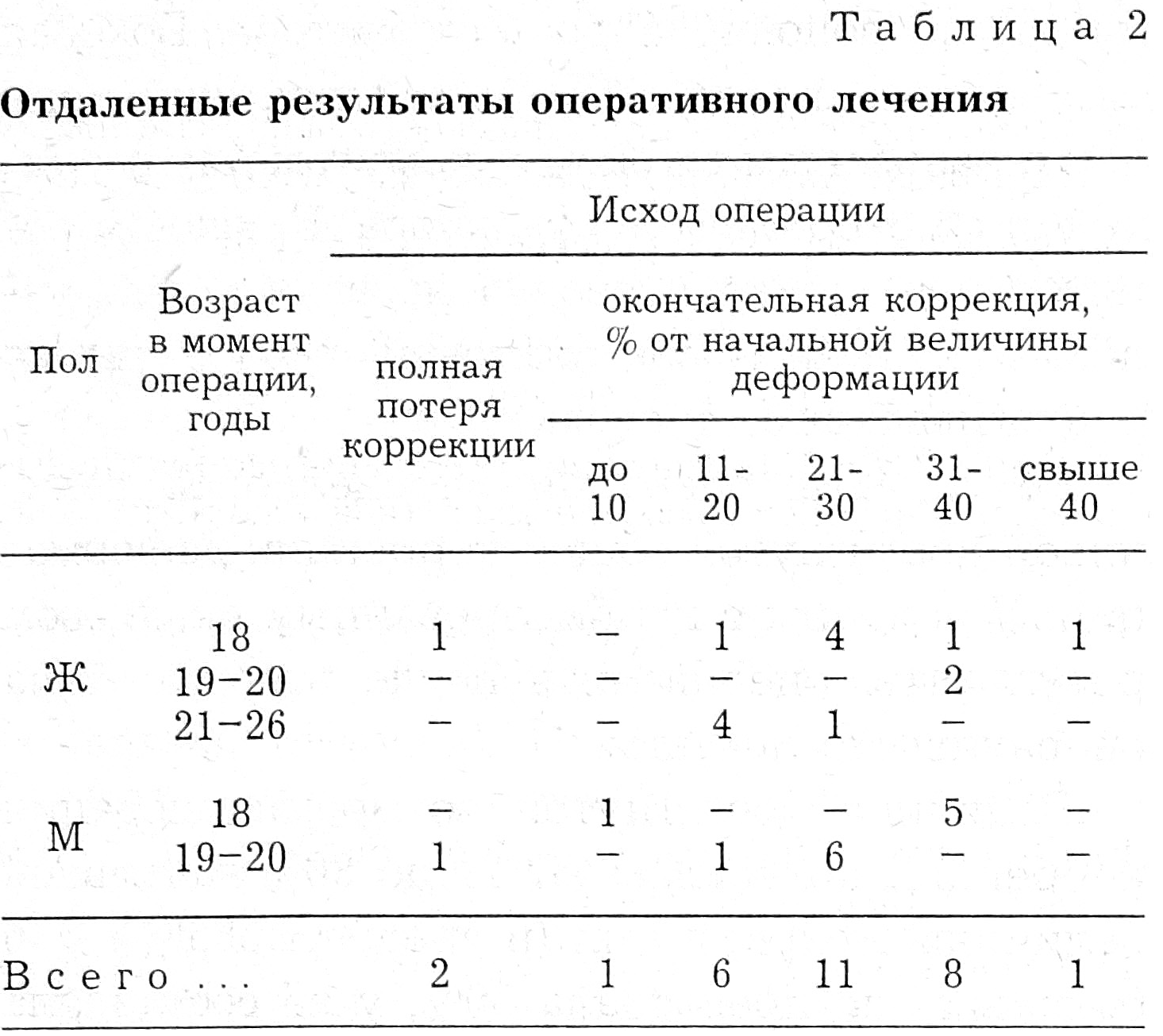 Отдаленные результаты в сроки не менее 2 лет (табл. 2) изучены у 29 больных (20 женщин и 9 мужчин). Из них 4 наблюдались 2 года, 12 человек — 3 года, 6 человек — 4 года, 7 — от 5 до 9 лет. У 2 больных произошла полная потеря коррекции, у остальных окончательная коррекция составила от 9,9 до 49% начальной величины деформации.