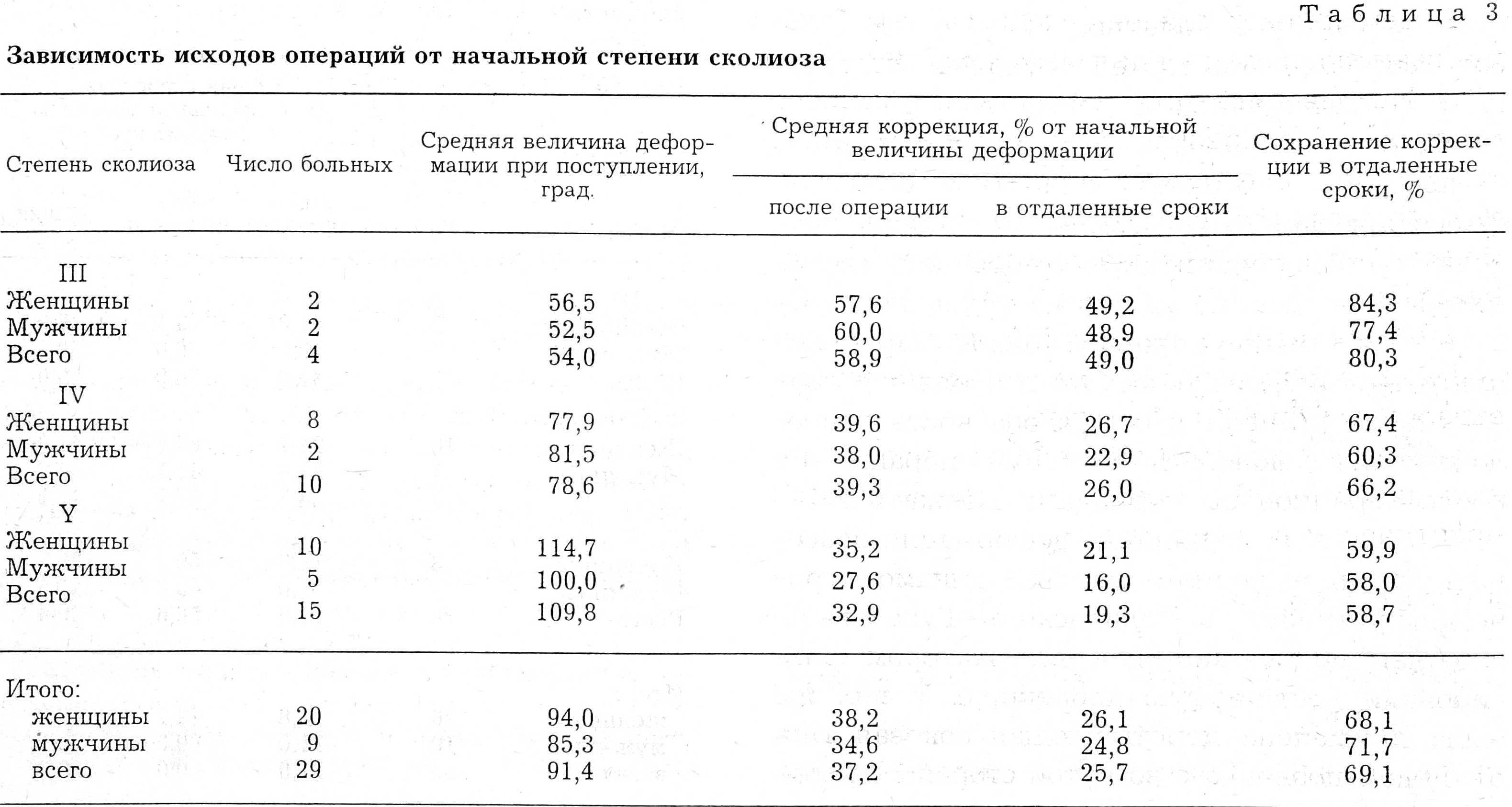 Как видно из табл. 3, при III степени сколиоза окончательная коррекция составляла в среднем 49% начальной величины деформации (сохранилось 80,3% достигнутой коррекции), при IV степени — 26% (66,2%), при V степени — 19,3% (58,7%) соответственно. В целом у 29 больных окончательная коррекция составила 25,7% начальной величины искривления, было сохранено 69,1% достигнутой при операции коррекции. Хотя ближайшие результаты у женщин были лучше, чем у мужчин, в отдаленные сроки окончательная коррекция у женщин и мужчин оказалась примерно одинаковой.