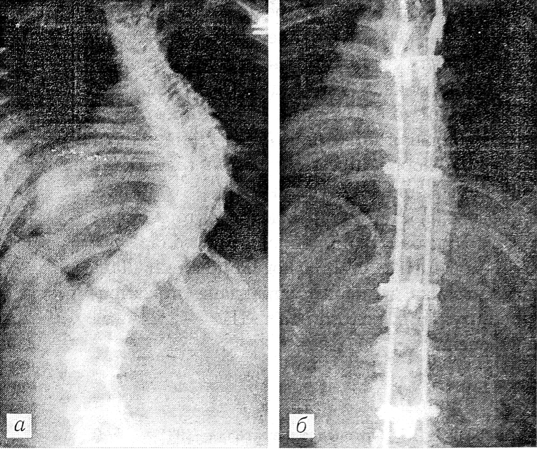 a — до операции: искривление 67° по Коббу; б — после операции: остаточная кривизна 23°, коррекция 66%. Девочка встала с постели на 10- е сутки, дополнительная внешняя иммобилизация не использовалась.