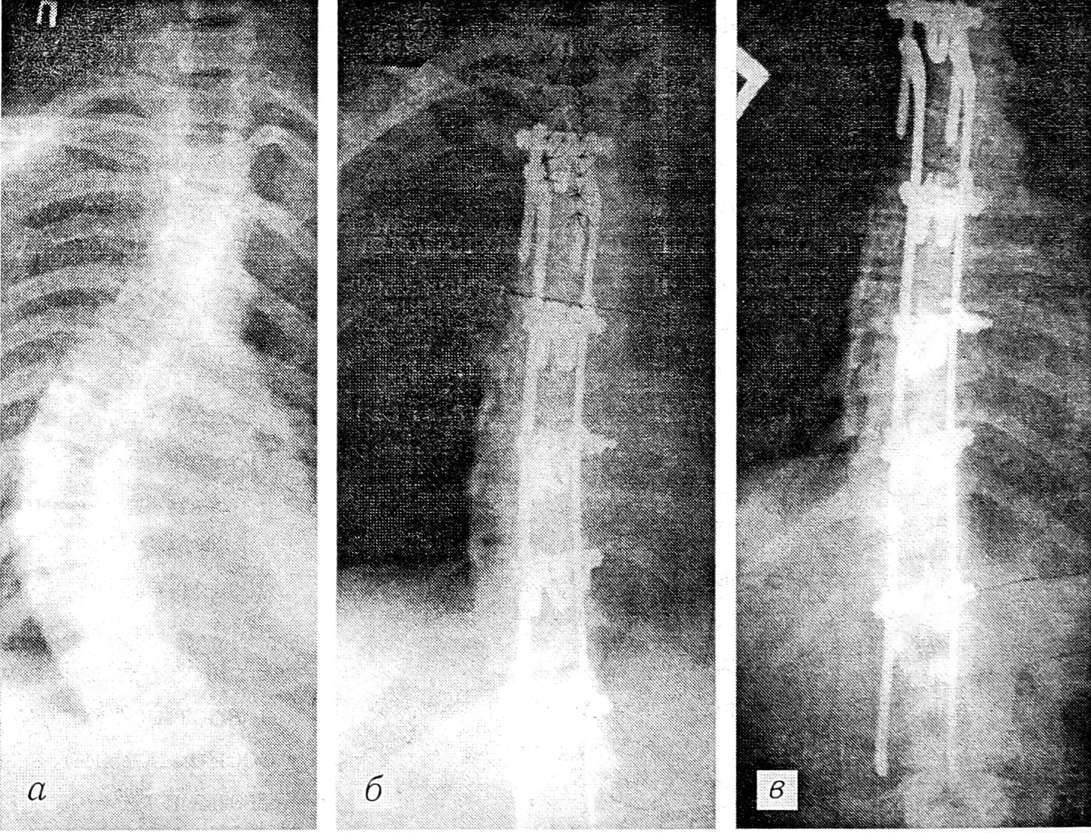 По этой методике в клинике оперировано 115 больных. В данной публикации приводятся результаты лечения, проведенного в период с 1991 по июнь 1994 г. 59 больным с прогрессирующими формами сколиоза II—IV степени (58 лиц женского и 1 — мужского пола). Возраст больных составлял от 8 лет до 21 года (в среднем 13,8 года). У 56 больных были диcпластические формы сколиоза, у 3 — врожденный сколиоз. Угол искривления варьировал от 24 до 118° и в среднем составлял 49,5°.