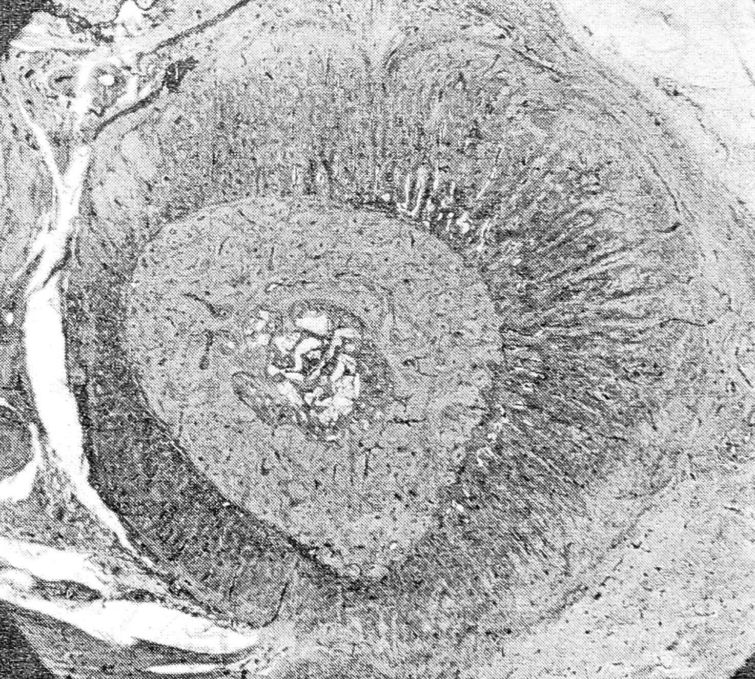 Морфологические исследования, проведенные в первые часы и дни после появления полосы просветления, показывают, что в рарефицированной компактной кости на уровне развивающегося гиперостоза от перенапряжения возникает поперечная трещина, надлом (рис. 3). Целость эндостального и периостального регенерата при этом сохраняется — полностью или частично. В дальнейшем (2—14-е сутки), если нагрузка на конечность продолжается, щель постепенно распространяется по поперечнику кости (рис. 4). Такое течение патологического процесса позволило назвать указанное повреждение кости «ползучим переломом» [12]. В зоне надлома в эти сроки образуются участки активизации остеопластической резорбции и пролиферации фиброретикулярных клеточных элементов, происходит врастание в щель остеогенной ткани. В костной ткани вблизи щели ползучего перелома нарастают некробиотические и некротические изменения, увеличивается количество микротрещин. Резорбция костных краев приводит к неравномерному расширению щели. Спустя 1—2 мес щель почти на всем протяжении заполняется фиброзной и хрящевой тканями (рис. 5).