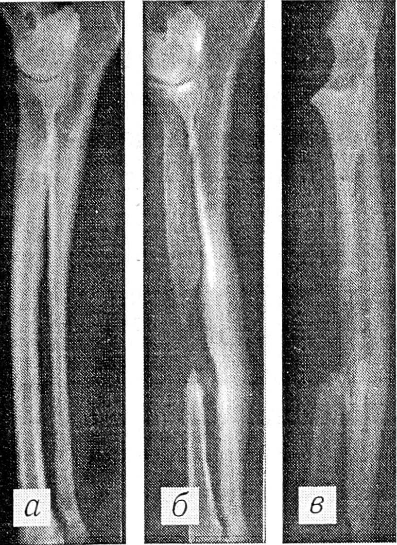 Рис. 2. Гиперостоз от перенапряжения: рентгенограммы локтевой кости до (а), через 130 (б) и 845 (в) сут функциональной перегрузки.