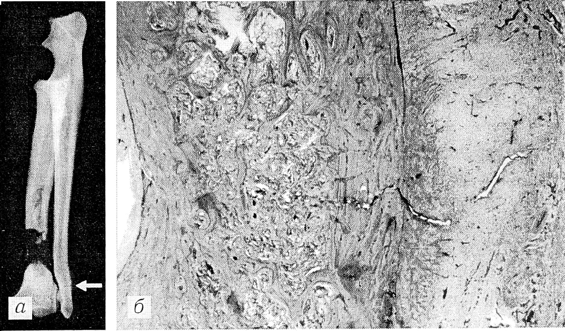 a — рентгенограмма: стрелкой показано поперечное просветление на уровне метадиафиза локтевой кости; б — гистотопографический препарат (тот же случай): надлом компактной кости с частичным повреждением периостального и эндостального регенерата (окраска гематоксилином и эозином. У в. 20).
