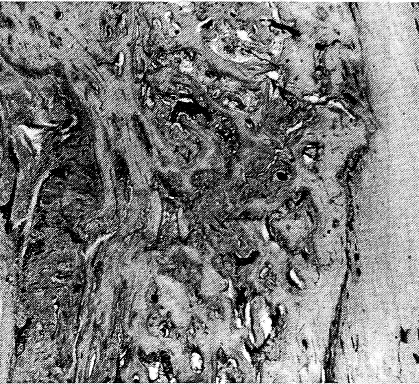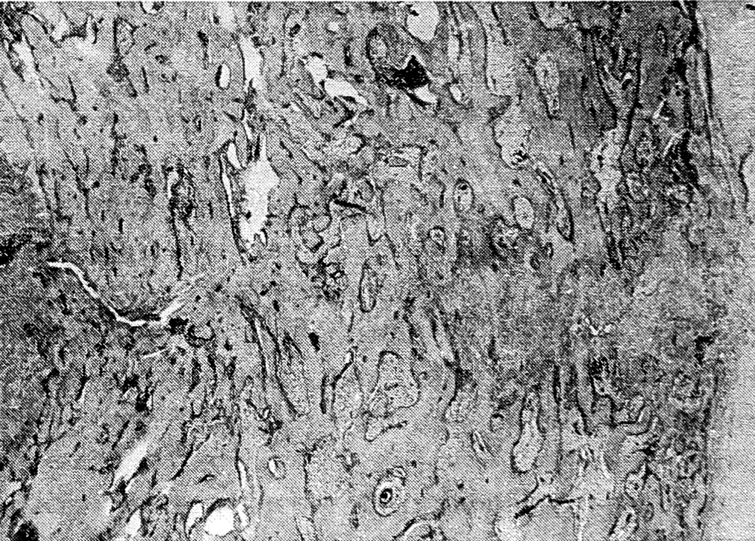 Рис. 4. Распространение щели по поперечнику кости при ползучем переломе: заполнение периферических отделов щели остеогенной тканью (9-е сутки со дня возникновения ползучего перелома).