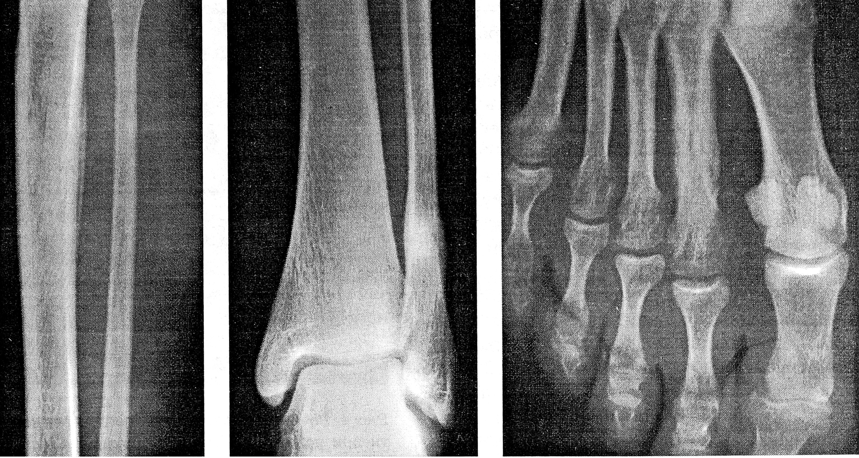Кроме того, были проанализированы данные клинико-рентгенологического наблюдения за 28 больными в возрасте от 4 до 65 лет с патологической перестройкой бедренной [4], большеберцовой [8], малоберцовой [2] и плюсневых [14] костей.
