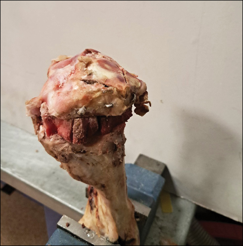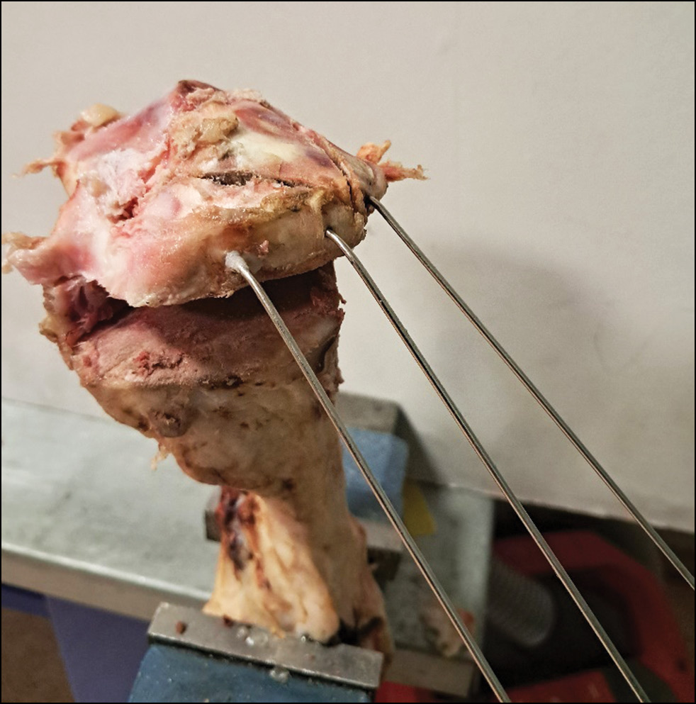 Все испытания были проведены на проксимальном отделе свиной большеберцовой кости с имитацией перелома типа 41В3 по классификации АО. Для этого в мыщелке свиной кости выпиливали метафизарный дефект высотой 2,0 см, с глубиной, соответствующей передне-заднему размеру мыщелка, и шириной до межмыщелкового возвышения кости. Высота оставляемой костно-хрящевой части мыщелка составляла около 4,0–5,0 мм. После этого по нарисованному лекалу с помощью долота выполняли переломы плато большеберцовой кости. Выполняли субхондральную фиксацию перелома тремя спицами диаметром 1,5 мм. Для экспериментов использовали две модели: модель А — область дефекта заполняли губчатой костной тканью, наружные концы армирующих спиц подбивали к осколкам суставной поверхности (рис. 1); модель В испытывалась без восполнения дефекта, наружные концы армирующих спиц в месте их входа в кость изгибали под углом 100–140° (рис. 2).