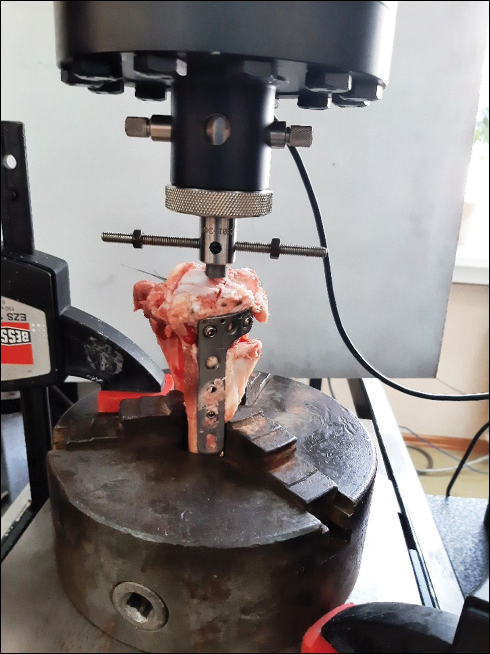 Были исследованы четыре группы образцов «имплантат — кость» в условиях экспериментально выполненного однотипного оскольчатого перелома большеберцовой кости свиньи. Для моделирования вариантов фиксационных свойств были использованы следующие материалы: 1) накостные титановые блокируемые пластины для мыщелков большеберцовой кости производства ООО «Остеосинтез»; 2) спицы Киршнера диаметром 1,5 мм, по 3 шт. на каждую систему «имплантат — кость», производства ООО «НПП «Имплант»; 3) блокируемые винты с прижимными гайками, шайбами, разработанные авторами и изготовленные ООО «Остеосинтез».
