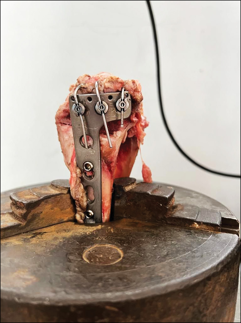 Оценить и сравнить фиксационные свойства разных биомеханических вариантов стабилизации оскольчатых внутрисуставных переломов в рамках накостного остеосинтеза на моделях проксимального метаэпифиза большеберцовой кости свиньи, оценить фиксационные свойства армирования напряжёнными и ненапряжёнными армирующими спицами.