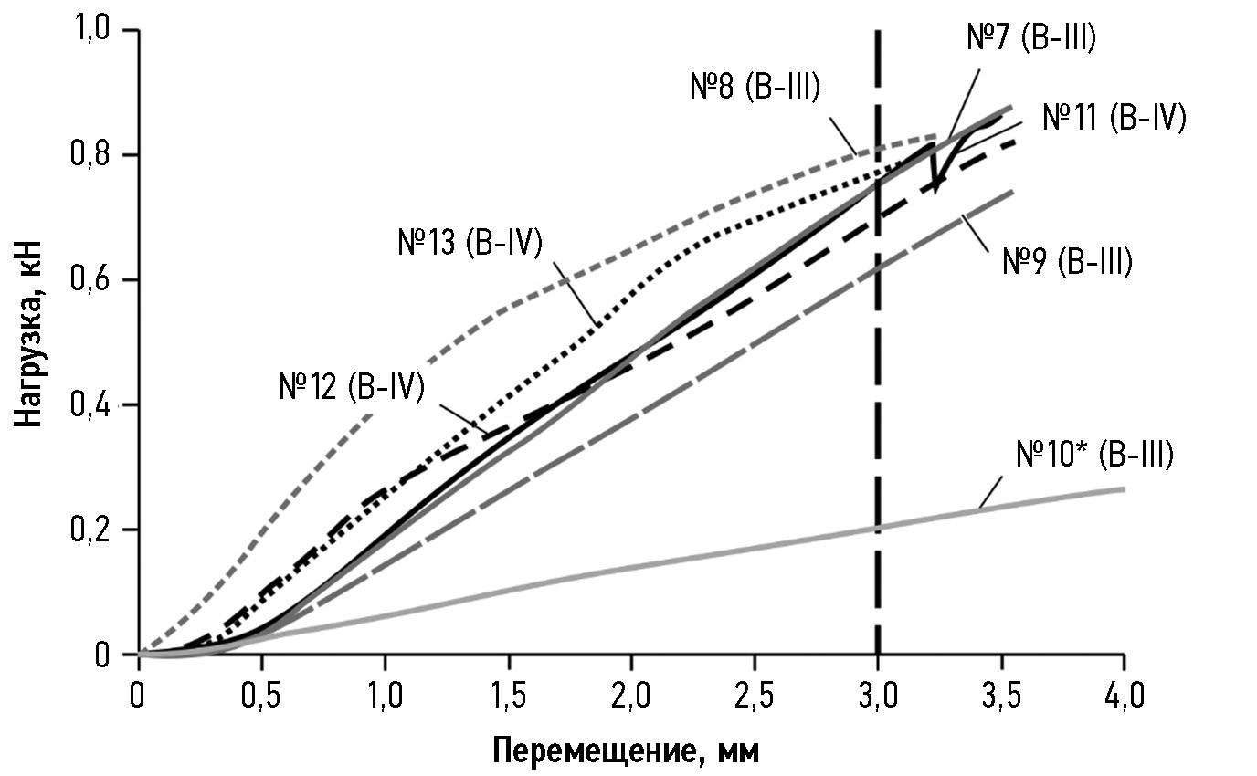 Оценивались кривые «нагрузка — перемещение». Оценочным критерием являлось падение сопротивления нагрузки на графике.