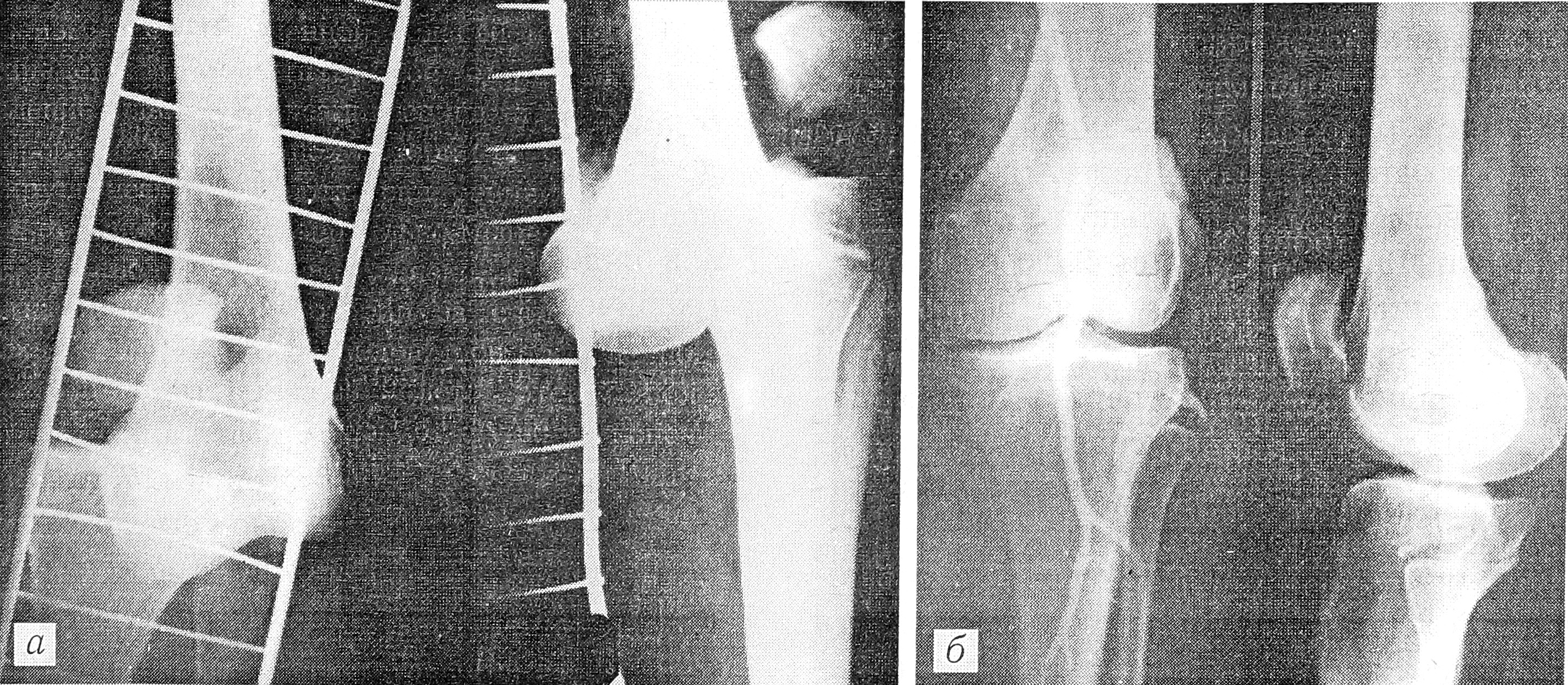 Рентгенограммы больной К. при поступлении (а) и через 9 лет после травмы (б).