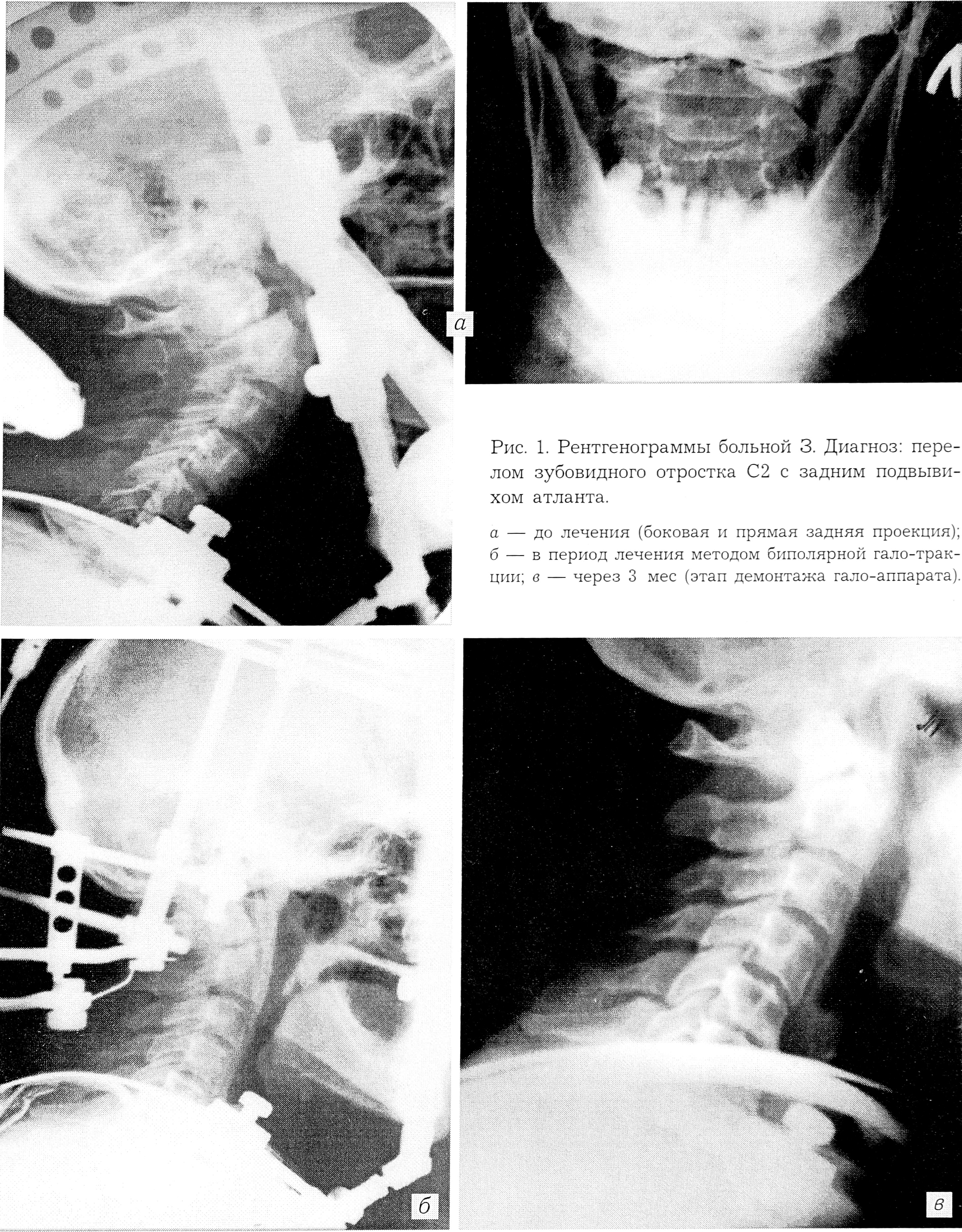 При лечении подобных повреждений в начальный период работы мы, так же как и при других вариантах смещений С1, прибегали к одномоментному устранению подвывиха С1 и репозиции зубовидного отростка С2 по Taylor, Morl. Первым этапом проводили вытяжение с помощью петли Глиссона по оси имеющейся деформации шейного отдела позвоночника (т.е. ни в коем случае не изменяя исходного положения головы). Затем, не прекращая вытяжения и зафиксировав надплечья, осуществляли этапное (при рентгенологическом контроле!) смещение головы кзади или кпереди — в зависимости от положения зуба С2. Лишь при удовлетворительной репозиции зубовидного отростка устраняли угловую деформацию. Фиксация торакокраниальной повязкой (рентгенологический контроль!) проводилась 3,5—4 мес. По истечении этого срока делали контрольную рентгенографию без гипсовой повязки: оценивали положение зубовидного отростка и наличие консолидации перелома.