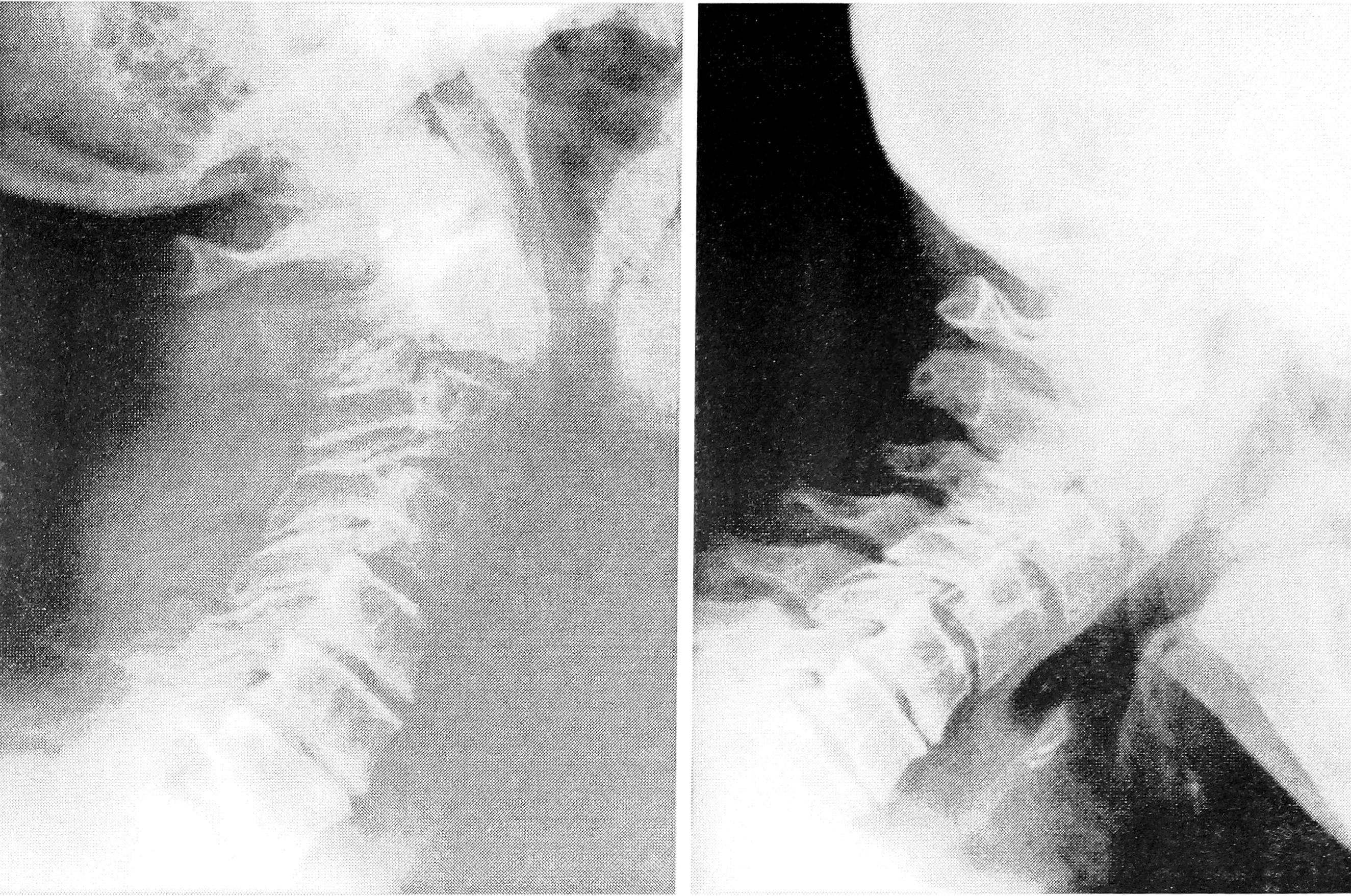 При двустороннем транслигаментозном подвывихе деротация головы не проводится. Последним этапом является разгибание в шейном отделе позвоночника (Taylor). После контрольной рентгенографии (профильная проекция), убедившись в восстановлении нормальных анатомических взаимоотношений, сразу накладываем торакокраниальную гипсовую повязку в положении гиперлордоза и вновь делаем контрольную рентгенографию. Повязку снимаем через 3 мес, проводим рентгенологическое обследование, дополняя его функциональными укладками. Сроки временной нетрудоспособности у наших больных колебались от 6 до 8 мес.