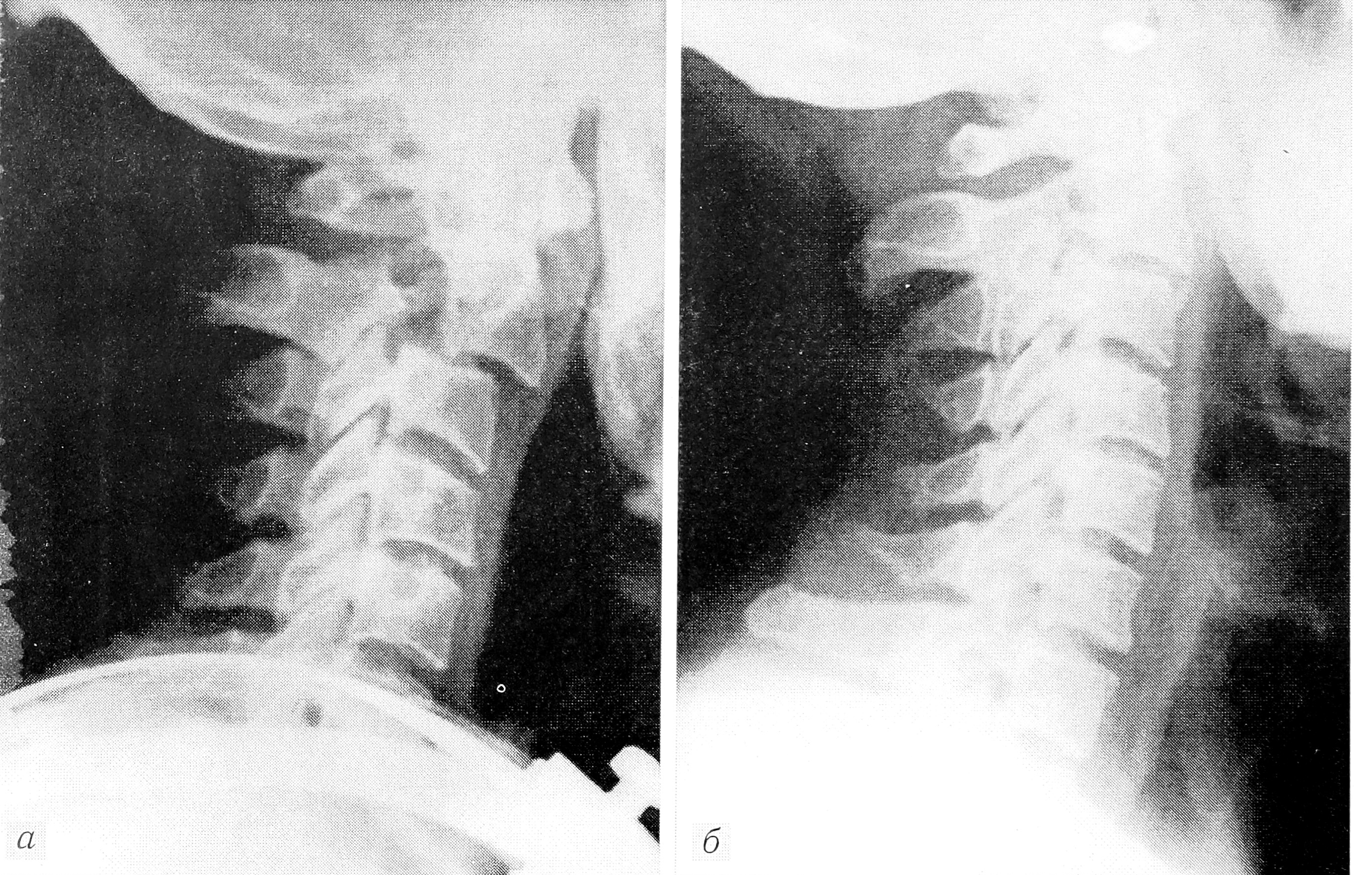 Рис. 3. Рентгенограммы больного К. Диагноз: травматический спондилолистез С2 II степени. а — начальный этап лечения методом гало-тракции; б — через 2,5 мес.