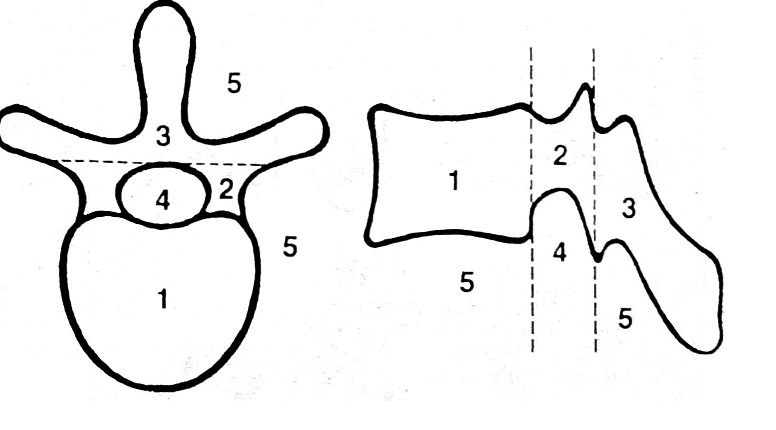 Рис. 1. Анатомические области позвонка: 1 — тело, 2 — ножка, 3 — дуга, остистый отросток, 4 — эпидуральное пространство, 5 — параспинальная область.