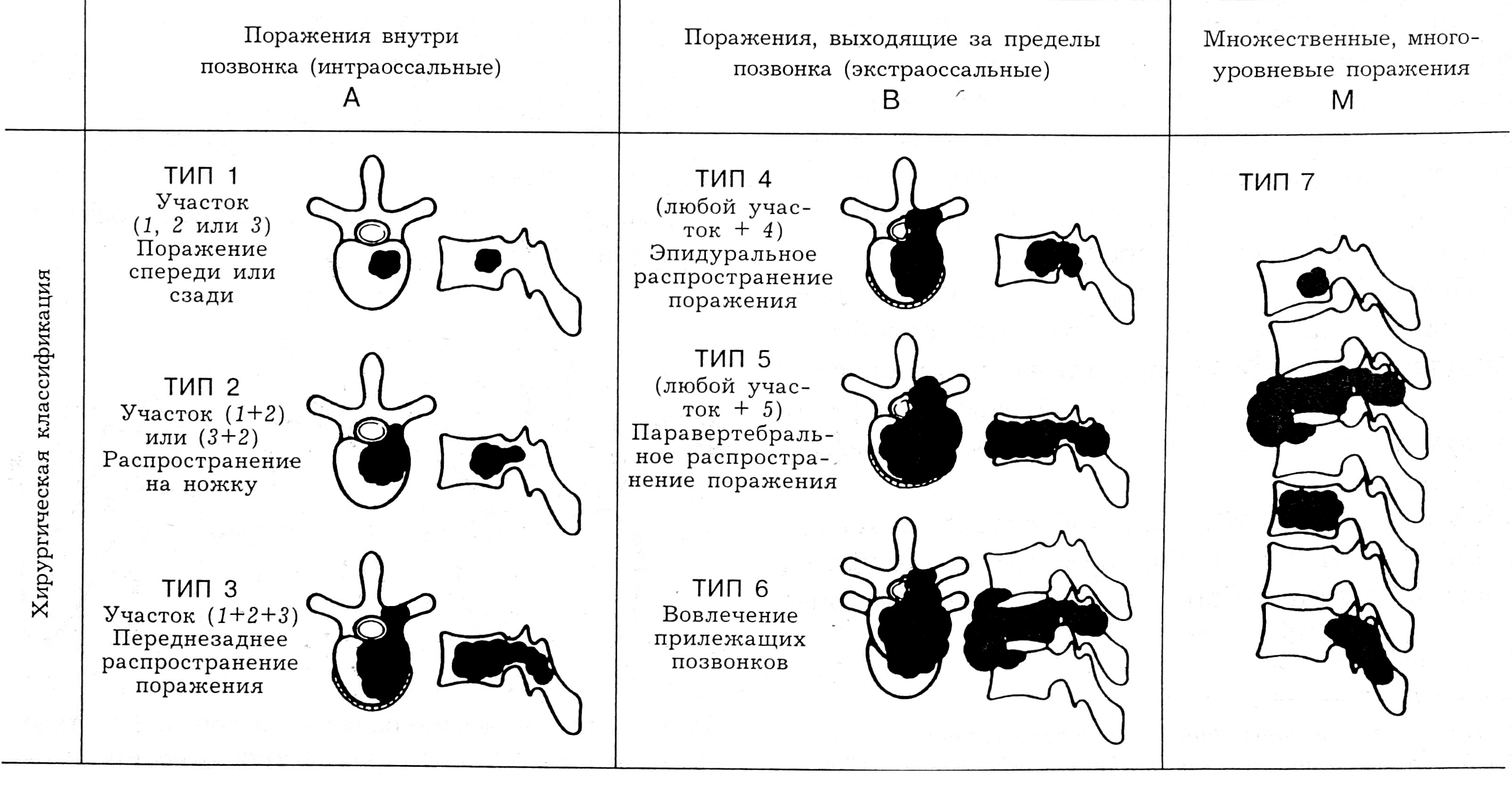 Наша новая классификация базируется на тенденции первичных и метастатических опухолей позвоночника к характерному росту в позвонке. В настоящее время мы считаем, что спондилэктомия единым блоком наиболее показана при поражениях типа 3 и 4, а также при некоторых поражениях типа 2 и в тщательно отобранных случаях поражений типа 5.