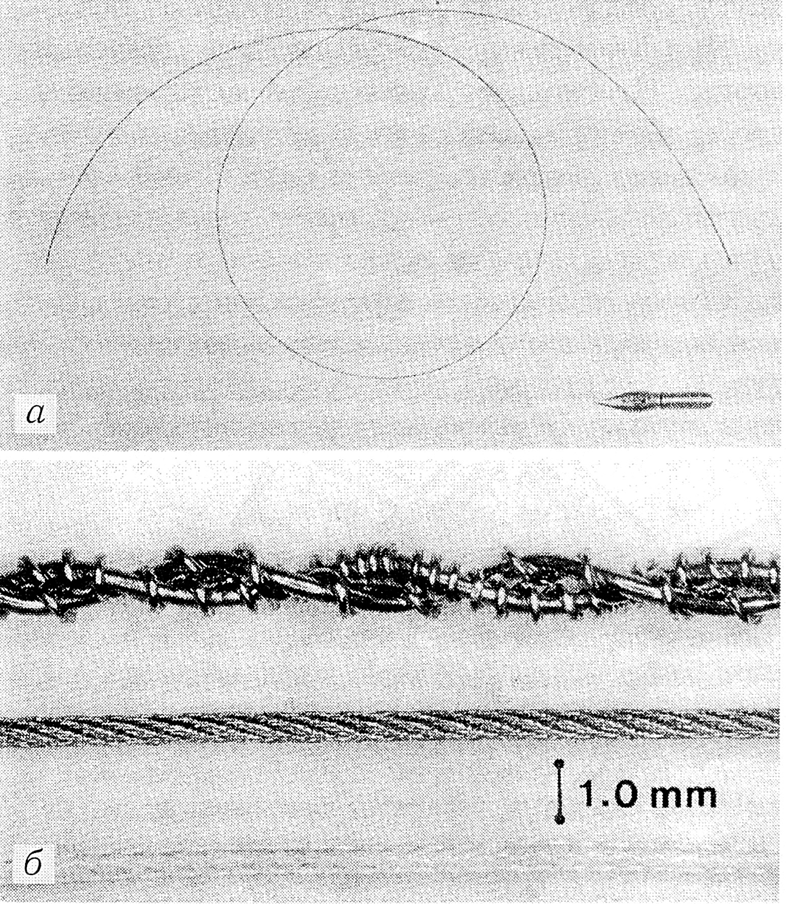 Рис. 3: а — гибкая пила из гладких переплетенных нитей из нержавеющей стали, разработанная первым автором, в сравнении с пером; б — пила Джильи (сверху), пила из скрученных проволочных нитей (в центре) и нить Дексона 1,0 (внизу).