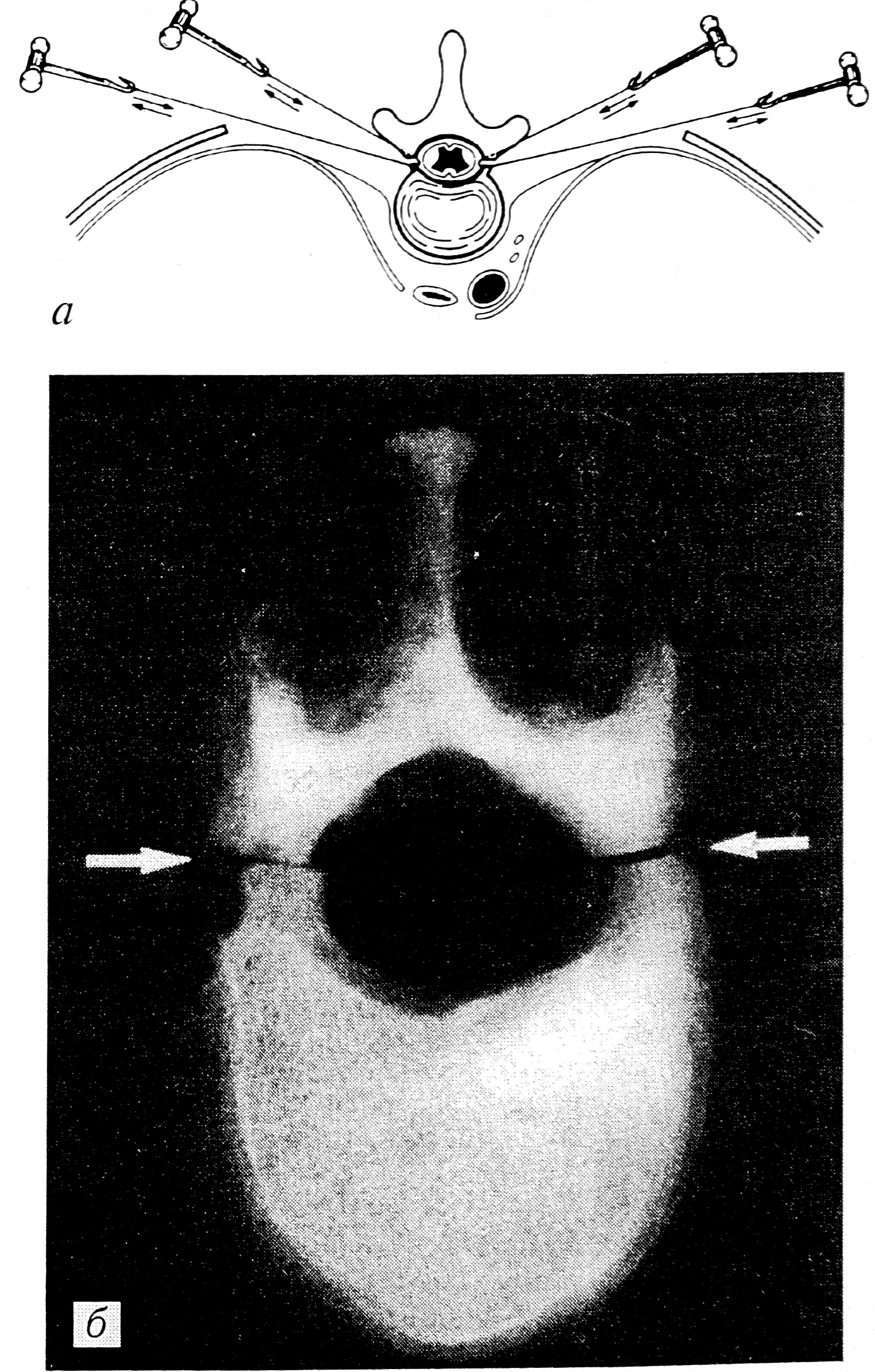 Рис. 4. Схема билатеральной педикулотомии (а) и рентгенограмма резецированного Т12 позвонка с метастазами рака молочной железы (б), стрелки указывают на область педикулотомии.