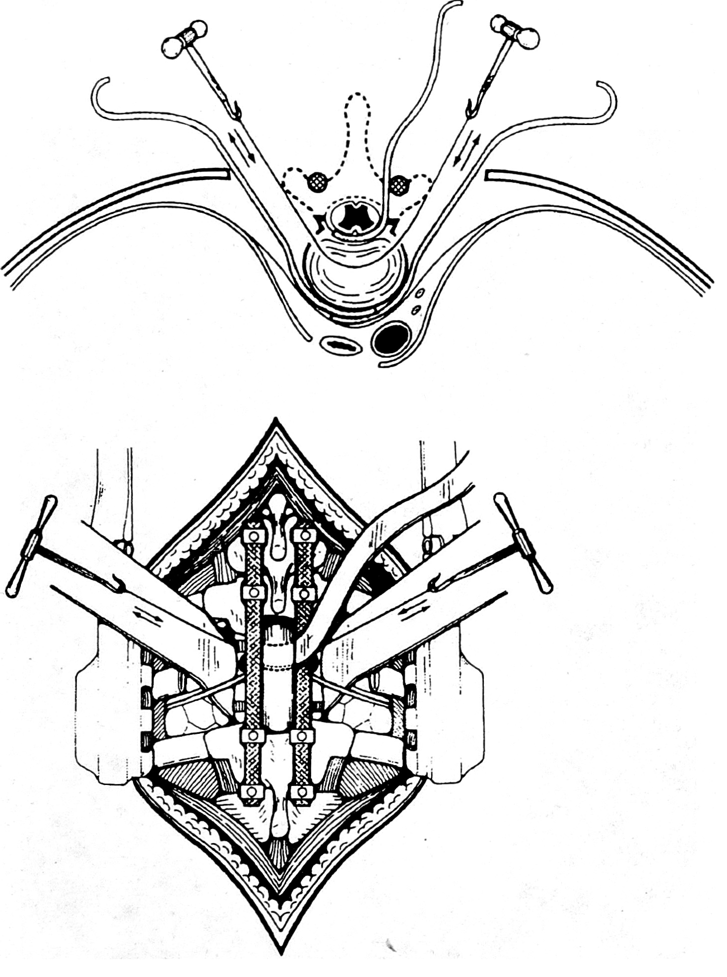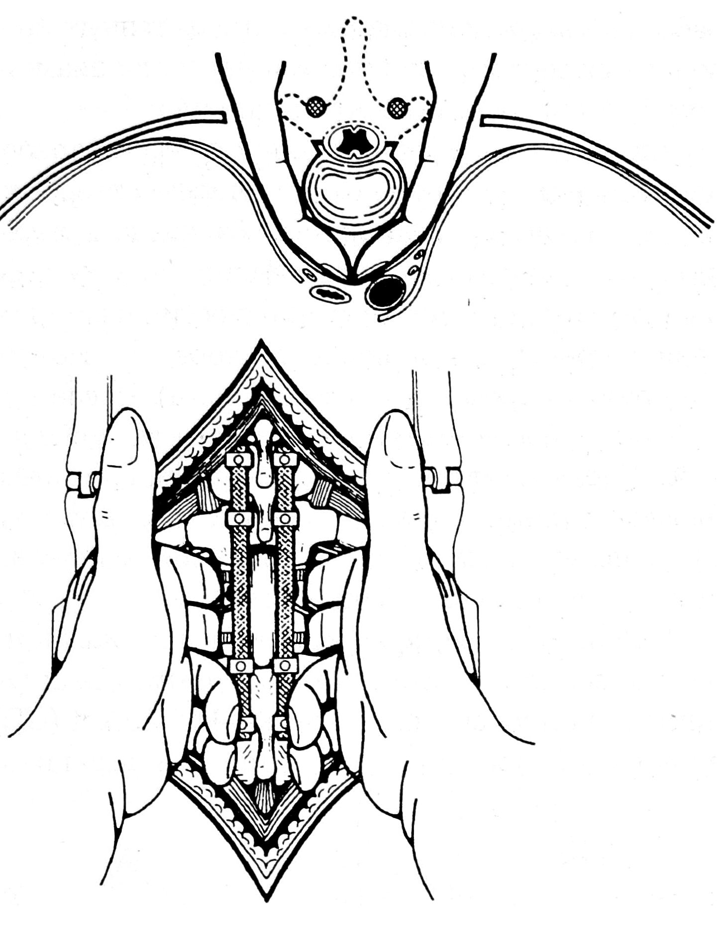 1. Выделение всей дуги и задних элементов. Больной находится в положении лежа на животе. Срединным разрезом открывают дугу пораженного позвонка и еще по две дуги сверху и снизу — в общей сложности по крайней мере пять дуг. Долотом удаляют верхние и нижние суставные отростки пораженного позвонка. С обеих сторон открываются поперечные отростки.