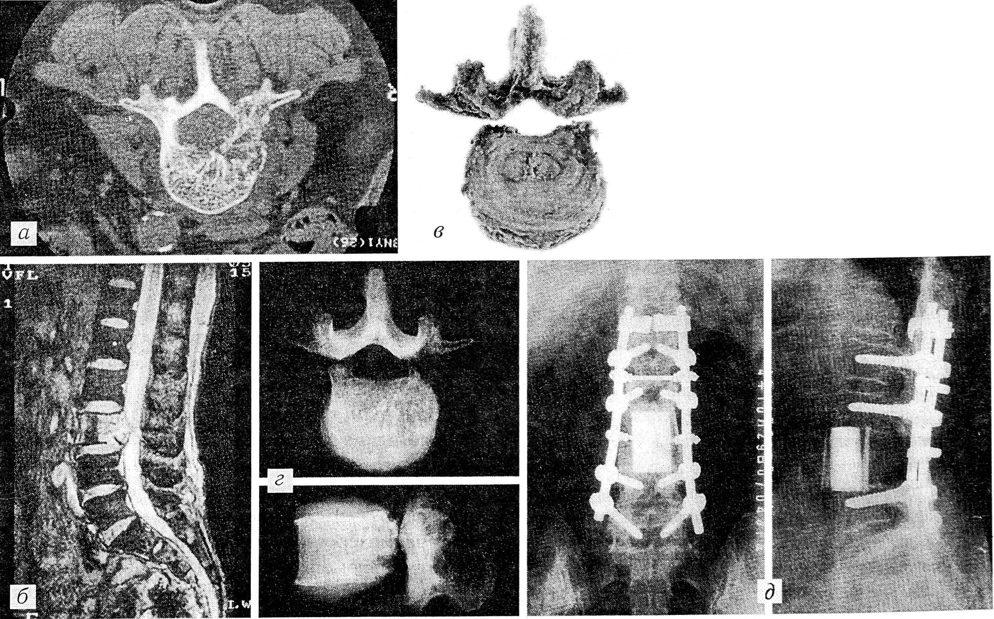 Рис. 7: а – компьютерная томограмма на уровне L3 позвонка (опухолевое поражение тела, ножки и дуги – тип 3); б – магнитно-резонансная томограмма (опухоль проникает в спинномозговой канал); в – препарат позвонка, удаленного при спондилэктомии единым блоком; г – рентгенограммы резецированного L3 позвонка; д – рентгенограммы пораженного участка позвоночника после реконструкции его с помощью устройств CD и импланта из апатит-волластонита, усиленного аллотрансплантатами.