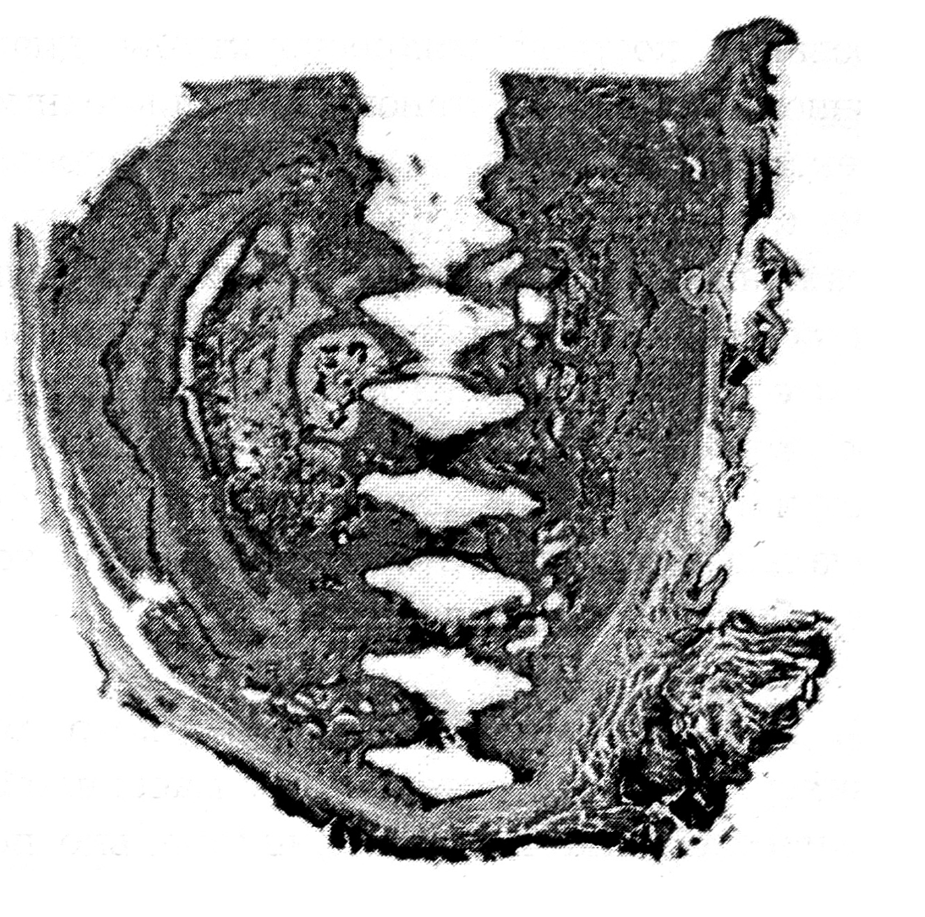 Характерной особенностью в экспериментах с остеосинтезом явилось различие реакции компактной кости на стороне пластины и на противоположной стороне. При отмечавшихся в ранние сроки после остеотомии симметричных аваскулярных нарушениях динамика восстановления под пластиной и на противоположной стороне была различной. Так, если на стороне, противоположной фиксатору, в зоне сращения ангиоархитектоника кортикальной пластинки приближалась к нормальной через 6—8 нед, то на стороне прилегания пластины отмечалось более длительное существование внесосудистых путей микроциркуляции и неправильной ориентации сосудов микроциркуляторного русла с явлениями декомпактизации кортикальной пластинки. Однако, несмотря на разные темпы восстановления васкуляризации, сращение по всему периметру кости носило первичный характер. Реакция костной ткани на металлическую пластину и винты в месте их контакта была аналогична таковой в контрольной серии экспериментов.