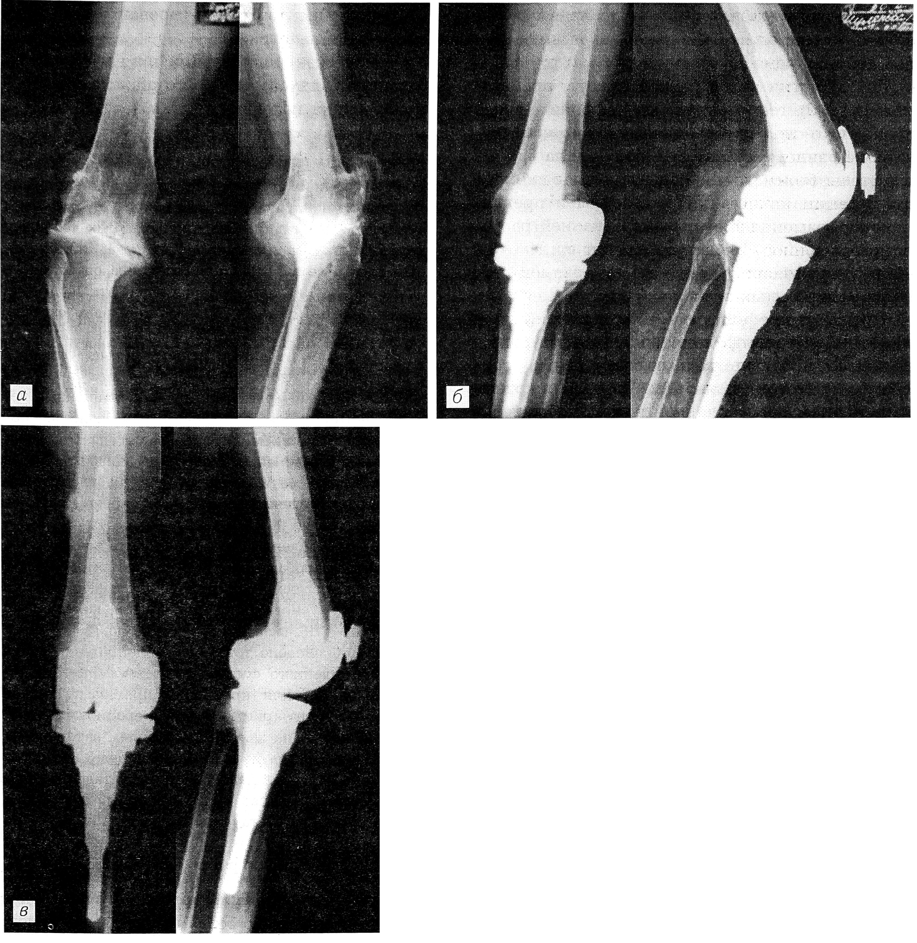 Больная Ш., 1918 года рождения, впервые обратилась в ЦИТО в 1990 г. с жалобами на боли в обоих коленных суставах, деформацию, нарушение опорности конечностей. Выявлены двусторонний гонартроз III стадии, контрактура обоих коленных суставов, варусная деформация (рис. 1, а). Больна в течение 30 лет. В 1988 г. произведена операция — лавсанопластика передней крестообразной и внутренней боковой связок правого коленного сустава. Боли в суставе продолжали беспокоить.