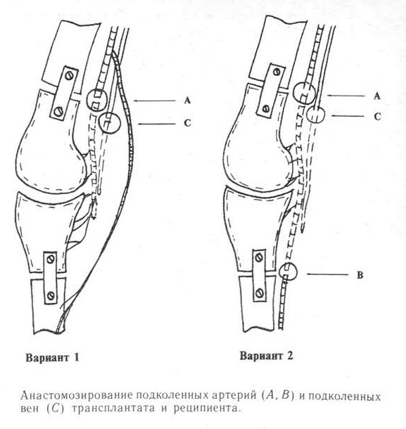 При пересадке коленного сустава возможны два варианта анастомозирования сосудов трансплантата и реципиента по типу конец в конец (см. рисунок). Исследование с наливкой сосудов при анастомозировании по варианту 1 было проведено на 7 собаках. Полученные результаты не дают основания говорить об адекватном восстановлении кровообращения в передней группе мышц голени и костях голени и стопы при питании их только через a. saphena.