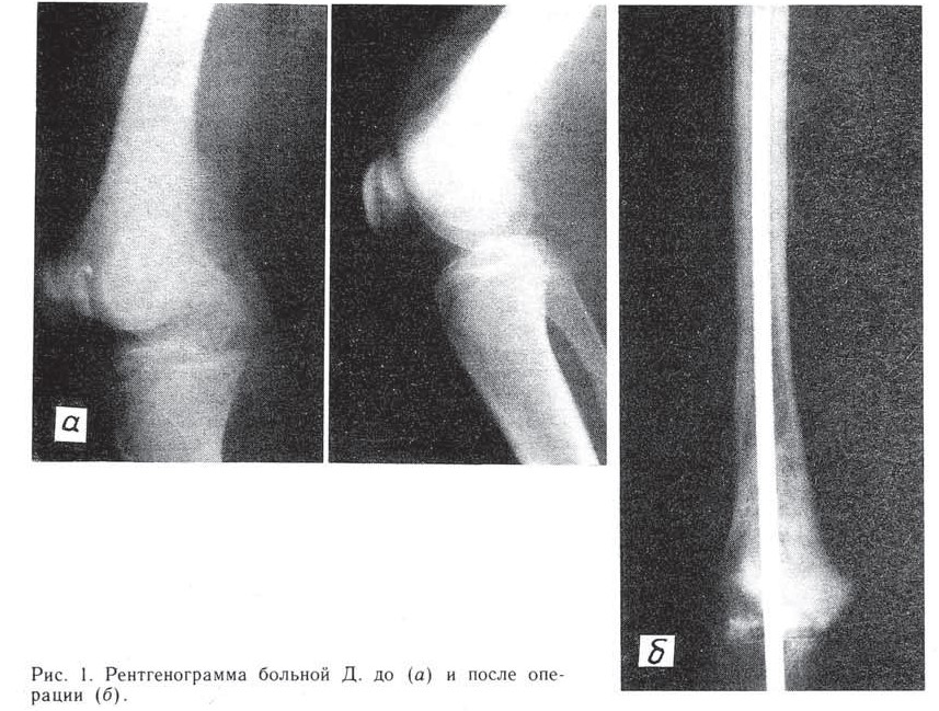 Больная Л-ва, 18 лет. Диагностирована остеогенная саркома дистального метаэпифиза правой бедренной кости. 16.07.69 произведена операция: резекция дистального суставного конца кости, кипячение его и реплантация с использованием массивного интрамедуллярного металлического фиксатора. Замужем, беременностей не было. Через 24 года жива, признаков рецидива и метастазов нет.