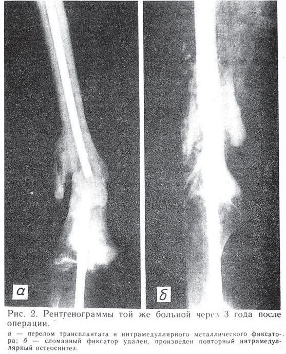 Больная Д., 17 лет, оперирована 12.05.69 по поводу остеогенной саркомы дистального метаэпифиза правой бедренной кости. Произведены резекция дистального суставного конца бедренной кости, кипячение его в течение часа и реплантация с использованием массивного интрамедуллярного фиксатора типа НИИХАИ (рис. 1). Через 3 года возник перелом фиксатора и трансплантата (рис. 2, а), в связи с чем больная вновь оперирована: произведены удаление сломавшегося фиксатора и повторный интрамедуллярный остеосинтез (рис. 2, б). Постепенно произошла перестройка трансплантата, консолидация его на уровне перелома с большеберцовой костью. Больная вскоре вышла замуж и (вопреки нашим советам) родила двоих детей. Резкие гормональные перепады, связанные с беременностями и родами, не обострили течение заболевания. Через 24 года после операции здорова. Старшему сыну 20 лет.