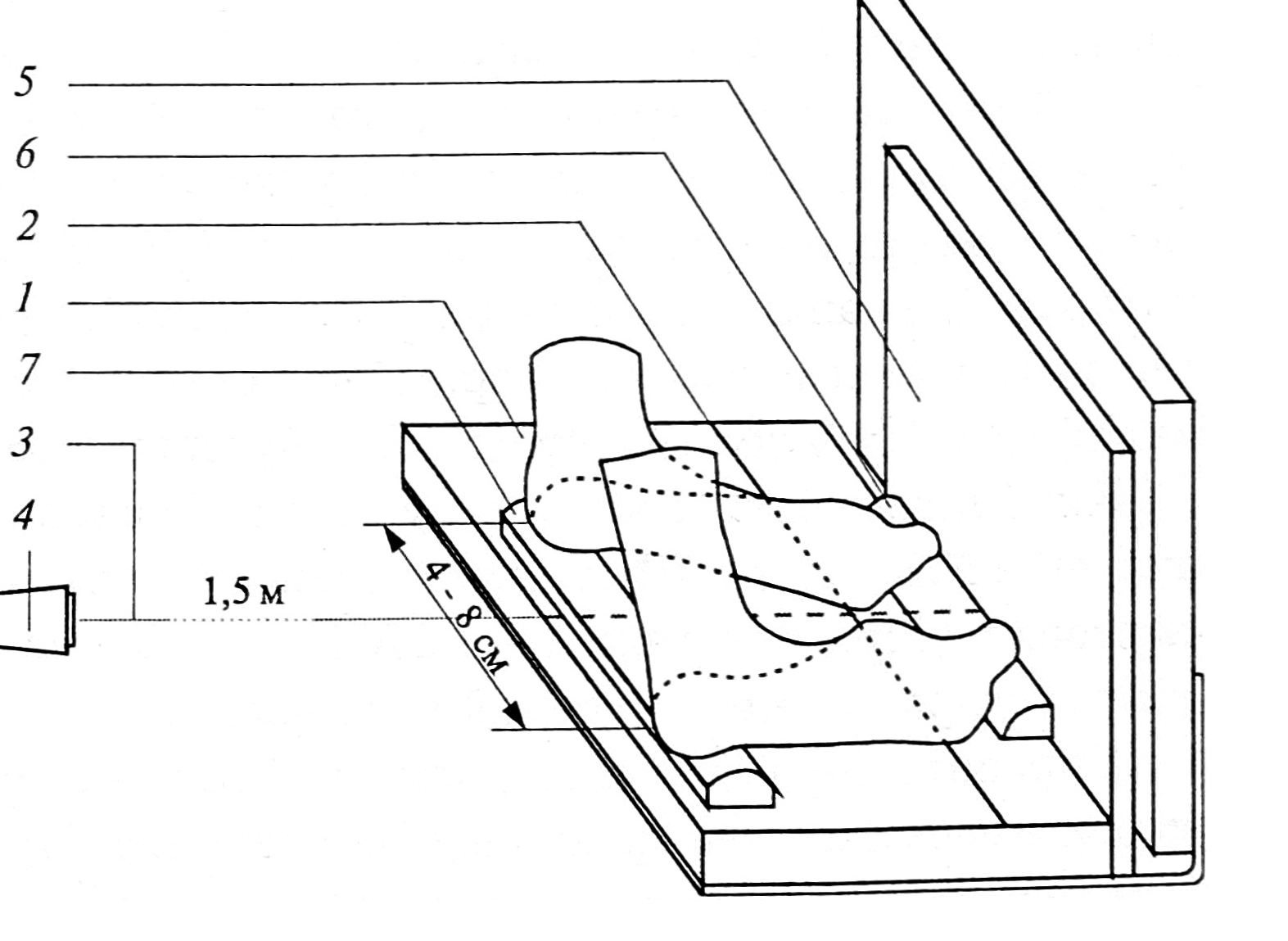 Учитывая, что при стоянии, как и при ходьбе, дистальные отделы плюсневых костей реализуют рессорную функцию, рентгенологическое исследование проводили в функциональном положении (стоя). Исследование начиналось со стандартной рентгенографии стоп в прямой проекции. Для рентгенографии в аксиальной проекции применялась подставка Менчук—Козловского в нашей модификации (рис. 1). На горизонтальную часть подставки помещалась деревянная пластина (1), на которой на расстоянии 5,5 см от переднего края была вмонтирована металлическая полоска сечением 2x1 мм (2) и проведена срединная продольная разметка (3), разделяющая пластину на две половины — для правой и левой стопы. Для выполнения рентгенографии стопы в аксиальной проекции центральный луч рентгеновской трубки (4) направлялся перпендикулярно вертикально установленной кассете (5) по срединной продольной разметке деревянной пластины.