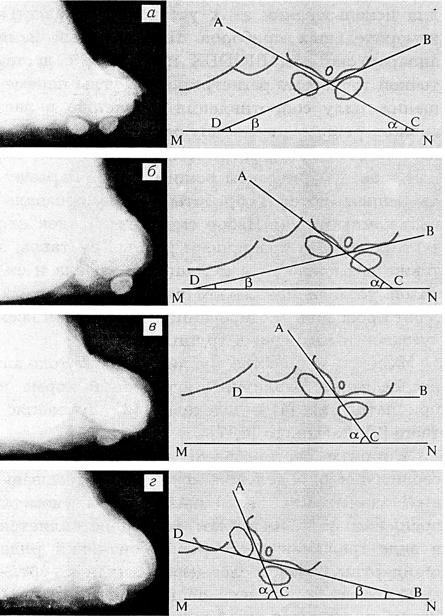 Перемещение вершины межсуставного бугорка головки I плюсневой кости по суставной поверхности МСК сопровождается поворотом суставной поверхности МСК к линии плоскости опоры. Путем проведения касательной линии к суставной поверхности МСК и продолжения ее до линии плоскости опоры получен и измерен угол наклона суставной поверхности МСК к плоскости опоры (<МСК). По значению <MCK выделено 4 стадии поперечного плоскостопия [5]: норма — ZMCK больше + 20° (рис. 2, а); I стадия — <MCK меньше + 20°, но больше 0°, свод сохранен (рис. 2, б); II стадия — ZMCK равен 0°, «перевал» (рис. 2, в); III стадия — <MCK меньше 0°, до -20°, прогрессирующее разрушение свода (рис. 2, г); IV стадия — <MCK больше —20°, свод разрушен (рис. 2, б).