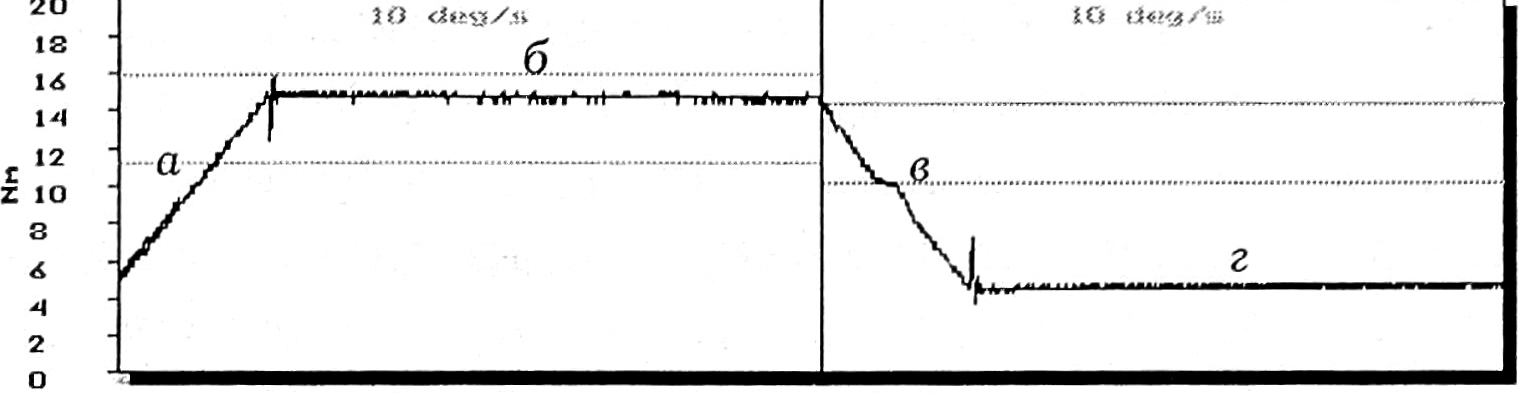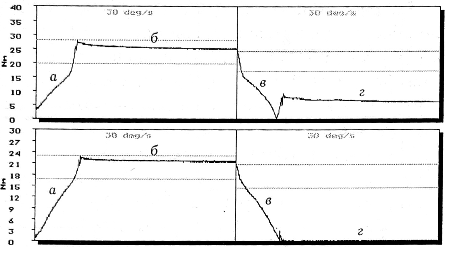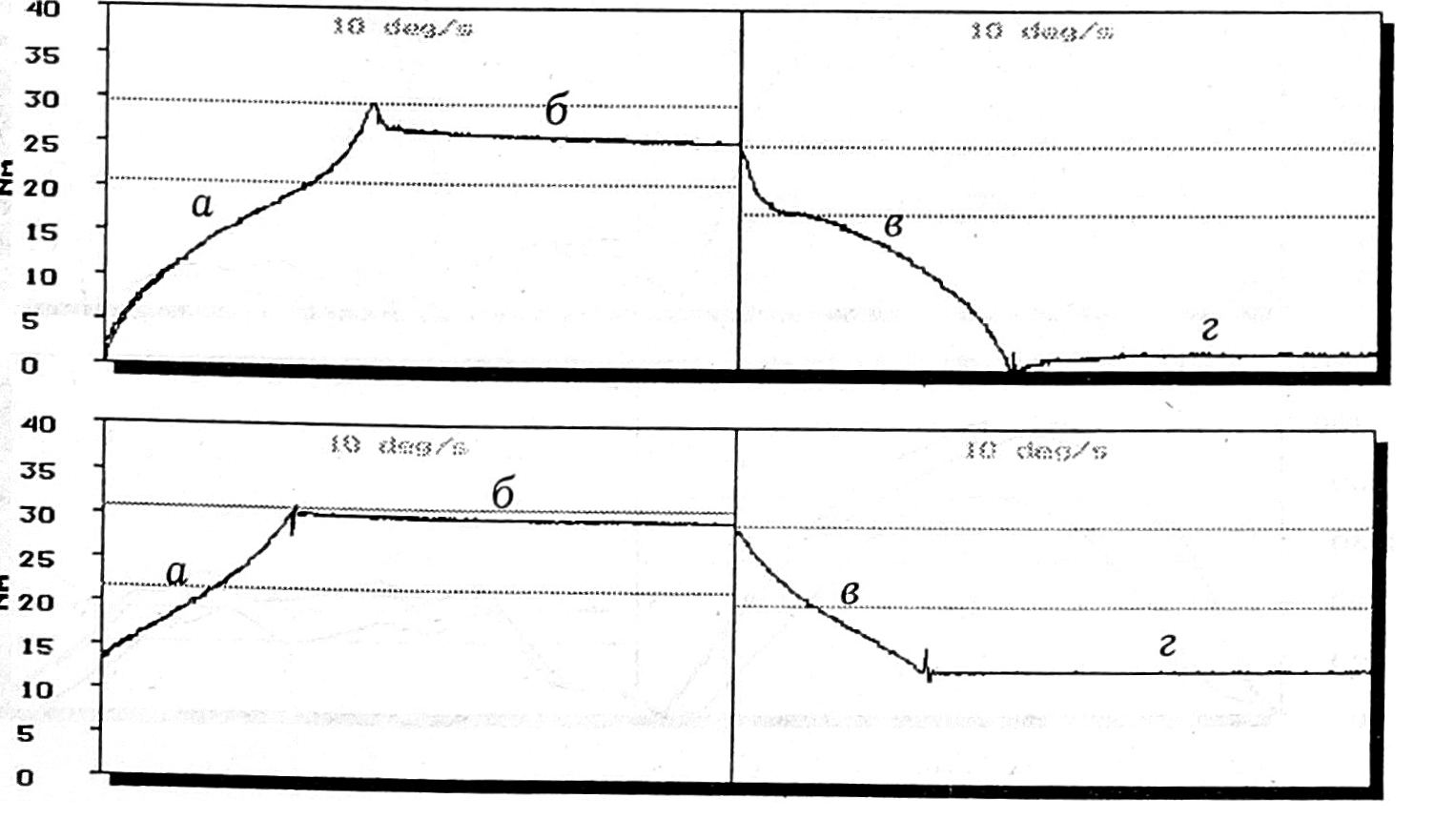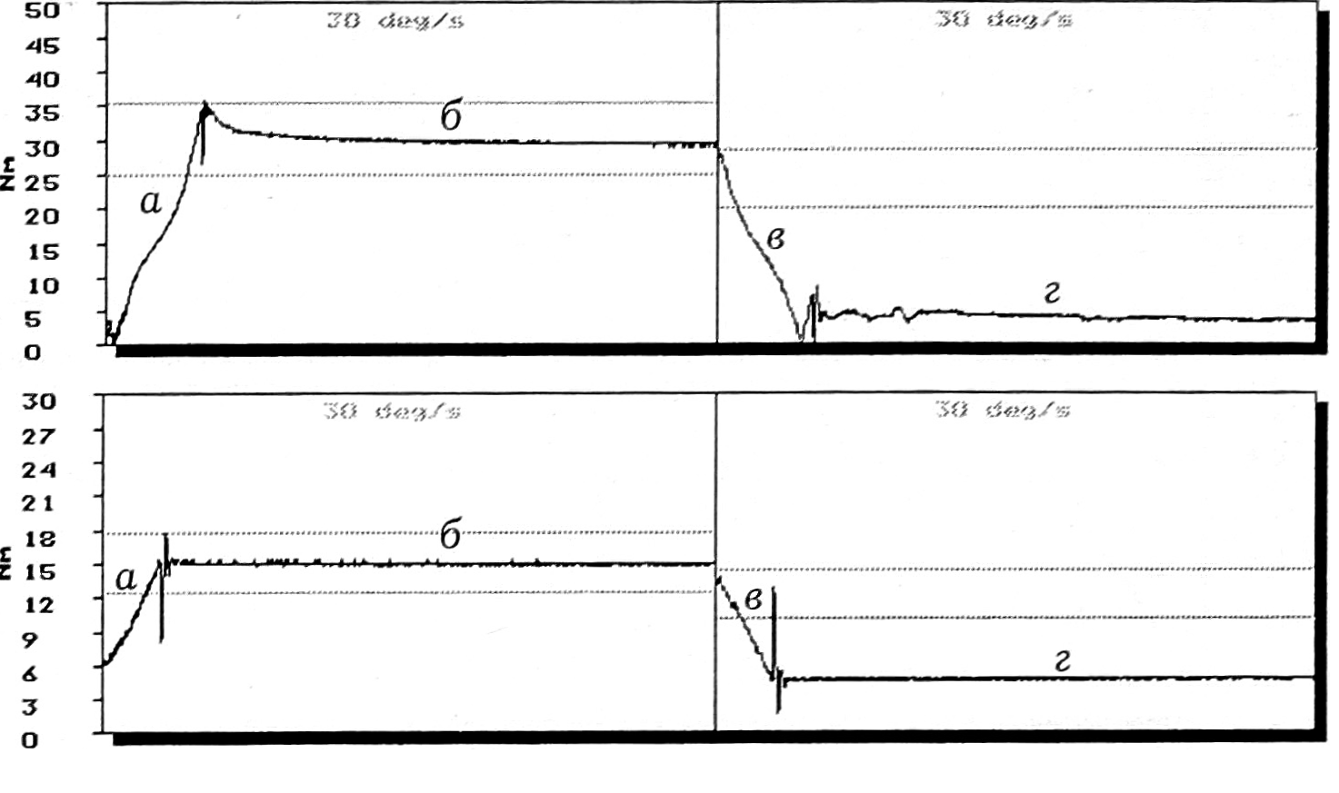 Здесь и на рис. 2, 4 и 5: а — фаза движения голени из положения максимального сгибания до точки максимального разгибания, б — фаза задержки движения в точке максимального разгибания (10 с), в — фаза обратного хода, г — фаза задержки движения в точке максимального сгибания.