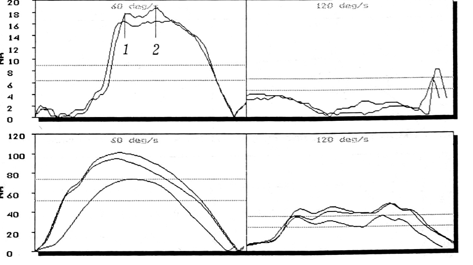 Для получения объективных параметров, характеризующих контрактуру, была проведена серия предлагаемых нами тестов с использованием системы BIODEX. Обследовано 20 больных в возрасте от 16 до 47 лет с контрактурами коленного сустава, развившимися в результате переломов надколенника (2), повреждений связок (8), оперативных вмешательств на капсульносвязочном аппарате коленного сустава (10).