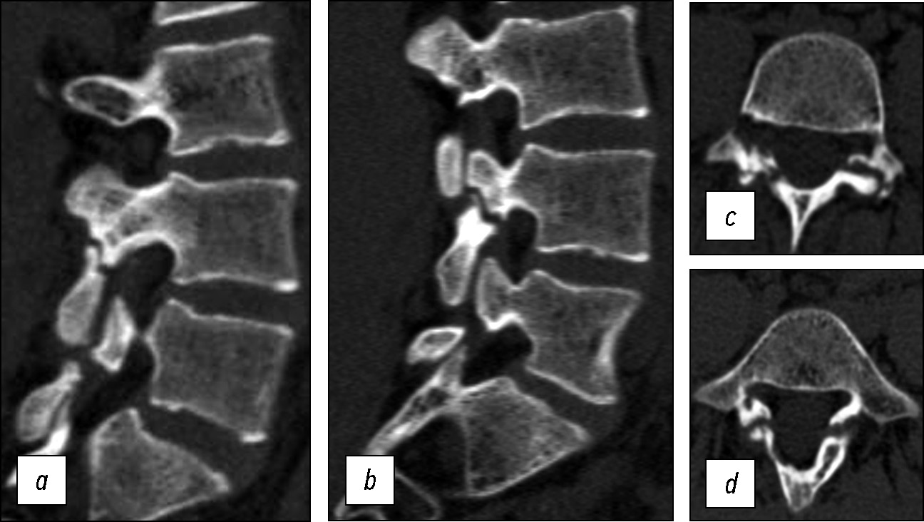 Рис. 2. КТ поясничного отдела позвоночника: a — сагиттальный срез справа, b — сагиттальный срез слева, c — аксиальный срез на уровне дужки L4 позвонка, d — аксиальный срез на уровне дужки L5 позвонка.