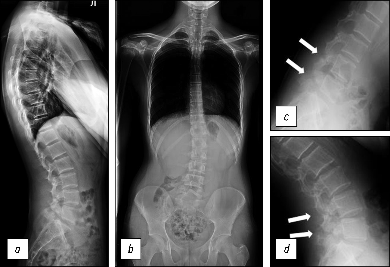По данным постуральной рентгенографии позвоночника подтверждён диагноз двухуровневого билатерального спондилолиза. Отмечено наличие левосторонней сколиотической деформации поясничного отдела позвоночника с вершиной на уровне L1-L2 позвонков, угол по Коббу — 15°. Параметры сагиттального баланса туловища — без значимых отклонений от нормы (PI=50°, PT=9°, SS=39°, LL=60°, TK=43,6°) (рис. 1а, b). По данным функциональной рентгенографии поясничного отдела позвоночника, в положении сгибания и разгибания в боковой проекции определяется отсутствие явного изменения спондилолизного дефекта дужки L4 позвонка, тень, образованная спондилолизным дефектом на уровне L5 позвонка, при сгибании расширялась (рис. 1c, d).
