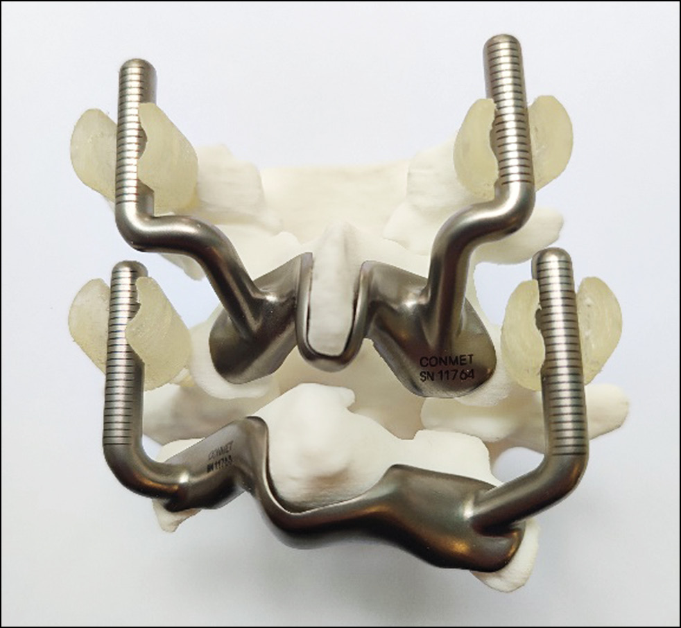 Заключение. Приведённый в статье клинический случай демонстрирует оперативное лечение двухуровневого билатерального спондилолиза с непрямым восстановлением целостности дужки позвонков с сохранением движений в позвоночно-двигательных сегментах, которое возможно успешно выполнять с использованием персонализированных имплантатов, изготовленных с применением аддитивных технологий. Ряд преимуществ подобных конструкций, таких как возможность проектирования положения и формы имплантатов с учётом индивидуальной анатомии пациентов, а также предотвращения контакта элементов металлоконструкции между собой при движении, позволяет улучшить результаты оперативного лечения двухуровневого спондилолиза.
