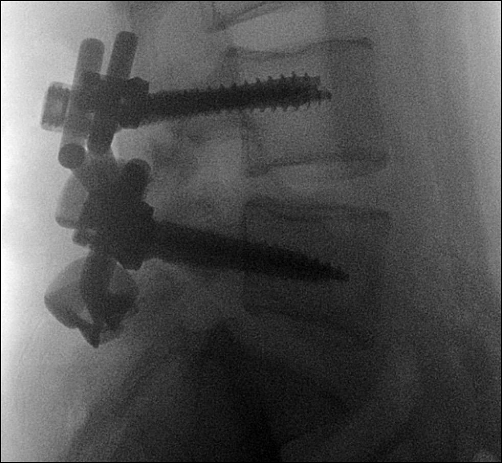 Ход операции: в положении пациента на животе под интубационным наркозом выполнен разрез кожи и подкожно-жировой клетчатки по линии остистых отростков от L4 до S1. Произведено скелетирование дужек L4, L5 позвонков, при этом надостистая связка сохранена. Выполнен гемостаз. Под контролем электронно-оптического преобразователя (ЭОП) произведена установка транспедикулярных винтов через корни дуг в L4 и L5 позвонки с двух сторон с сохранением суставных отростков. С помощью кусачек Керрисона удалена межостистая связка L4-L5, L5-S1. Изогнутым распатором выполнено скелетирование дужек в месте осуществления субламинарной фиксации. Установлена индивидуальная пластина на скелетированную дужку L4 позвонка, причём пластина проведена между остистыми отростками соответственно L4 и L5 позвонков. Аналогичным образом в сформированное отверстие между остистыми отростками L5 и S1 позвонков установлена пластина на скелетированную дужку L5 позвонка. Фиксирующие элементы пластин помещены в головки винтов и фиксированы блокировочными винтами (гайками). Проведён рентген-контроль с использованием ЭОП: положение металлоконструкций корректное (рис. 6). Рана промыта растворами антисептика, послойно ушита. Выполнен внутрикожный косметический шов. Интраоперационная кровопотеря составила 100 мл. Пациент был вертикализирован в первые сутки после операции. Отмечал умеренную боль в области вмешательства, которая регрессировала в течение трёх дней на фоне приёма нестероидных противовоспалительных препаратов. Выполнены контрольное КТ-исследование и постуральная рентгенография позвоночника — подтверждены правильное положение имплантатов и фиксация зоны спондилолиза (рис. 7). На четвёртые сутки после операции пациент выписан из стационара. Рана зажила первичным натяжением.