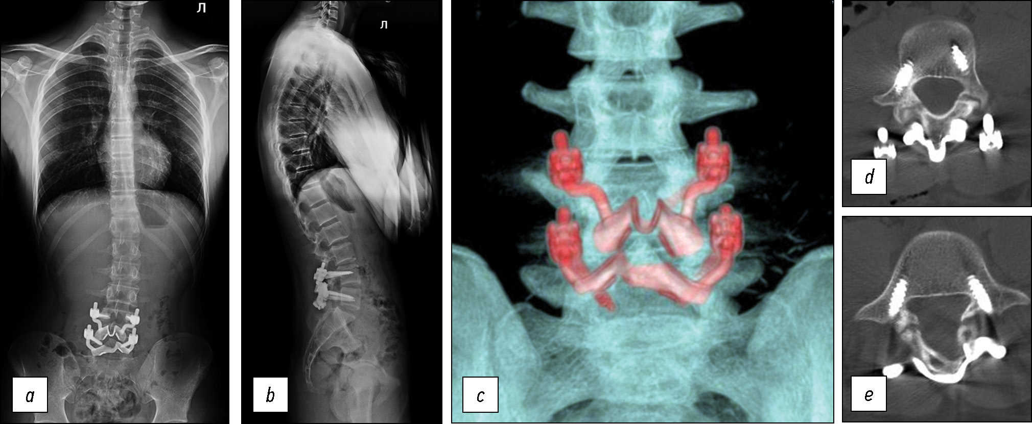 Рис. 7. a, b постуральная рентгенография позвоночника, положение конструкции правильное, фиксация зон спондилолиза стабильная, сагиттальный баланс не нарушен, c — КТ поясничного отдела позвоночника, 3D-реконструкция, d — аксиальный срез на уровне L4 позвонка, e аксиальный срез на уровне L5 позвонка.