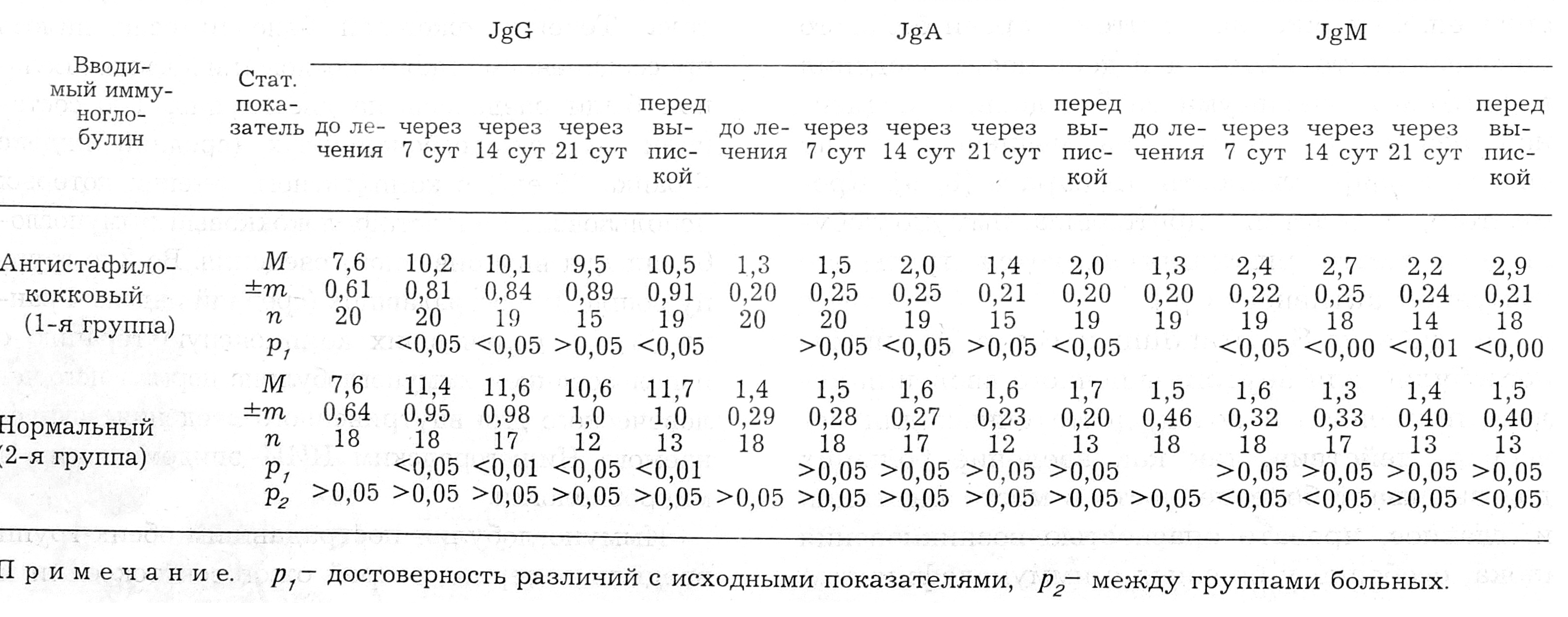 Иммуноглобулин пострадавшим обеих групп вводили в период острой ожоговой токсемии и септикотоксемии с выраженными проявлениями интоксикации. При посеве раневого отделяемого выявлялся стафилококк, нечувствительный или малочувствительный к большинству применяемых антибиотиков. Антистафилококковый иммуноглобулин вводили внутривенно капельно со скоростью 15—20 капель в минуту ежедневно в суточной дозе 25 или 50 мл на фоне комплексного лечения, включавшего инфузионно-трансфузионную терапию коллоидно-кристаллоидными и углеводными растворами, аминокислотными препаратами и симптоматическими средствами (от 2 до 5 л в сутки). Количество вводимого иммуноглобулина в зависимости от возраста и массы тела пострадавших варьировало от 120 до 500 мл на курс лечения и определялось глубиной, площадью ожогового поражения и выраженностью клинических проявлений инфекционных осложнений ожоговой болезни.