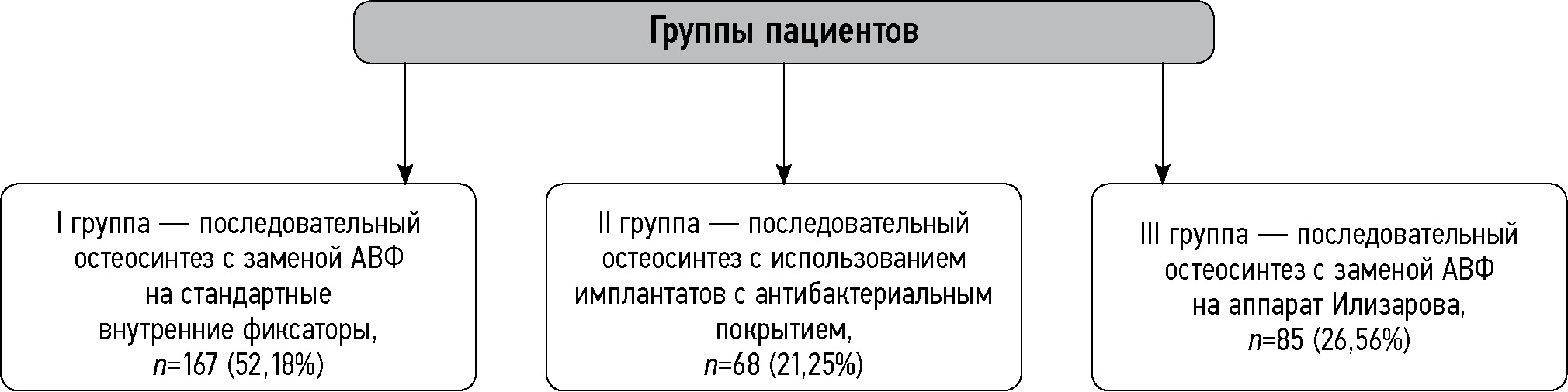 - III группа — пациенты с осложнённым течением раневого процесса, которым вследствие наличия высокого риска прогрессирования инфекции при применении внутренней фиксации стержневой АВФ был заменён на спице-стержневой аппарат внутренней фиксации по Г.А. Илизарову.