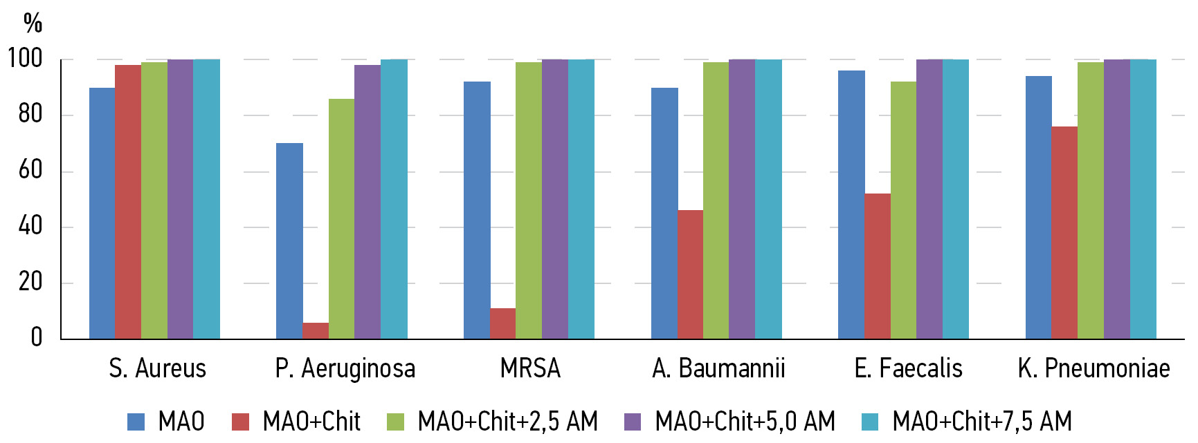 Рис. 2. Антибактериальное действие разработанных покрытий по отношению к внутригоспитальным штаммам бактерий: MAO — микродуговое оксидирование, Chit — хитозан, AM — амикацин.