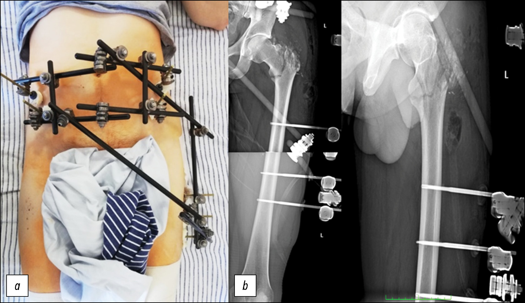 Рис. 3. Пациент 1: a — внешний вид пациента с наложенным аппаратом внешней фиксации компоновки «таз — бедро» — огнестрельное осколочное сквозное ранение проксимального отдела левой бедренной кости с разрушением большого вертела и чрезвертельным переломом со смещением отломков, b — рентгенограмма после первого этапа — стабилизация повреждённой конечности в аппарате внешней фиксации.