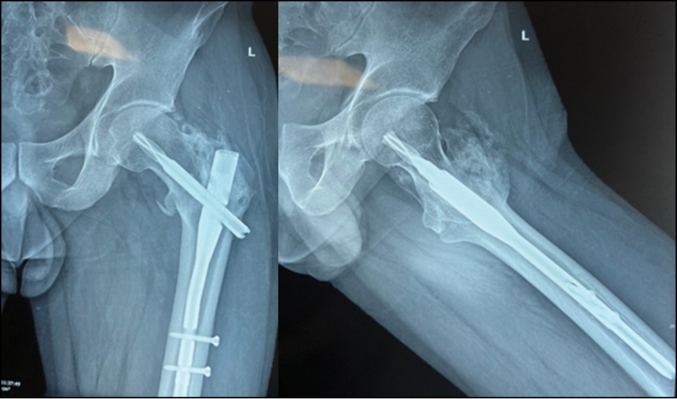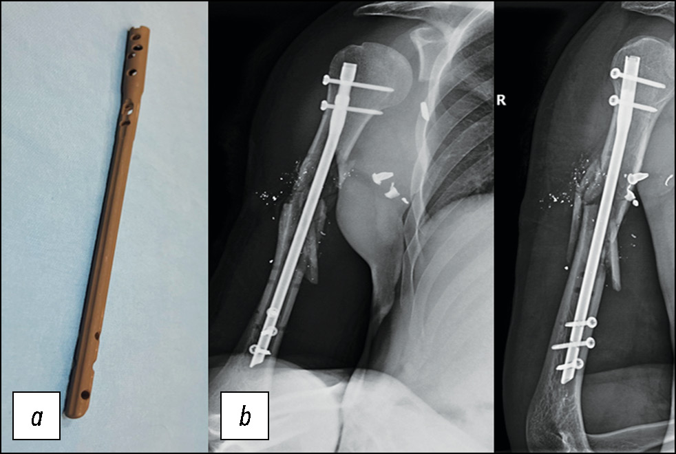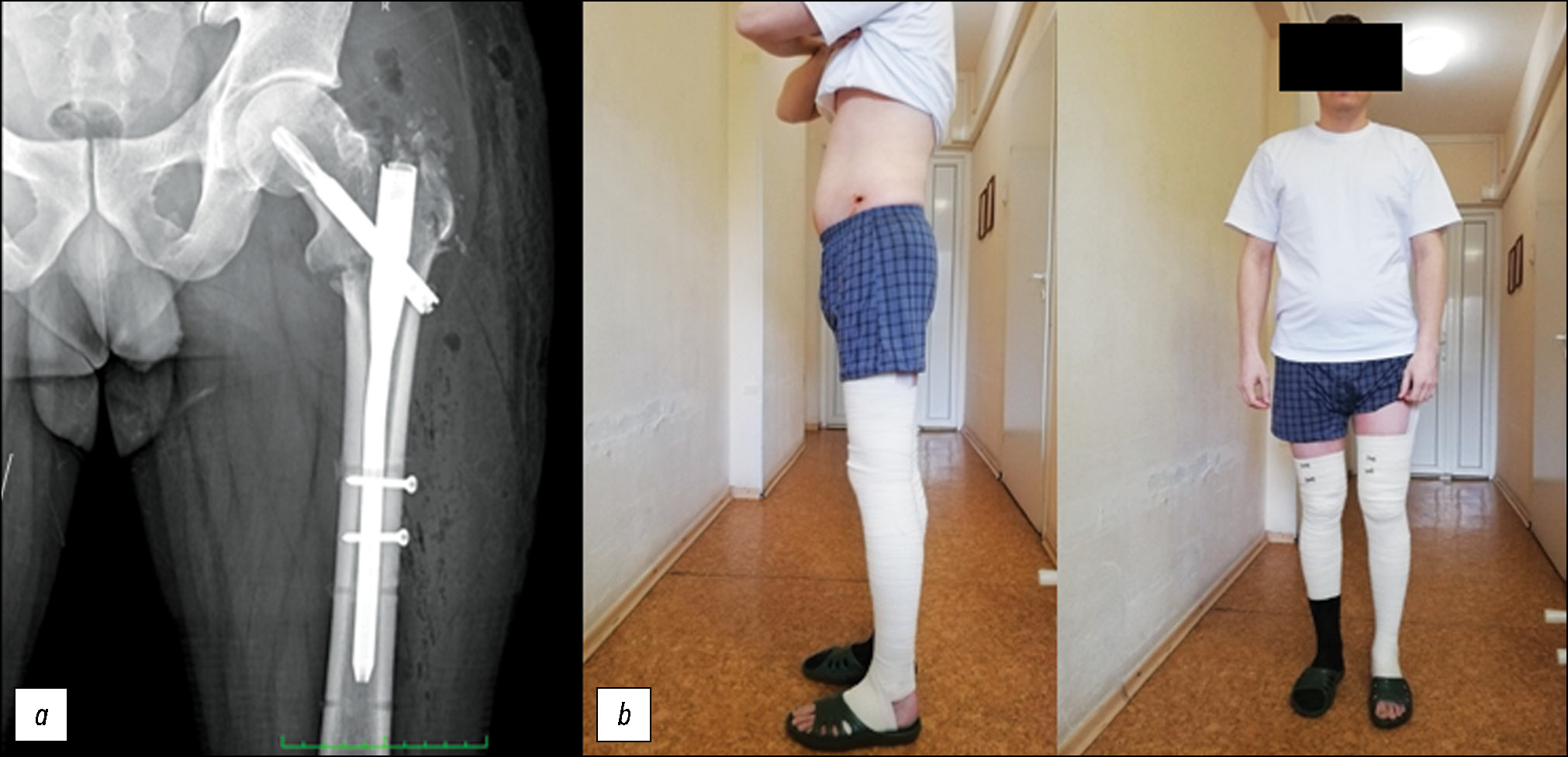 Рис. 4. Пациент 1: a — рентгенограмма после демонтажа аппарата внешней фиксации и внутреннего остеосинтеза проксимальным бедренным штифтом с блокированием, b — внешний вид в первые сутки после операции.