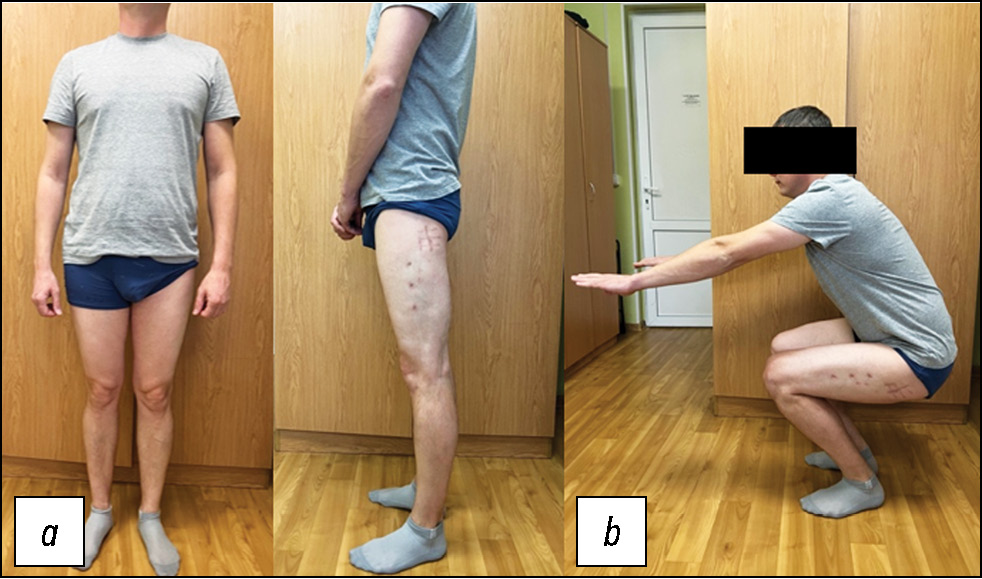 Рис. 6. Пациент 1: a — спустя 6 месяцев после операции, b — функциональный результат лечения.