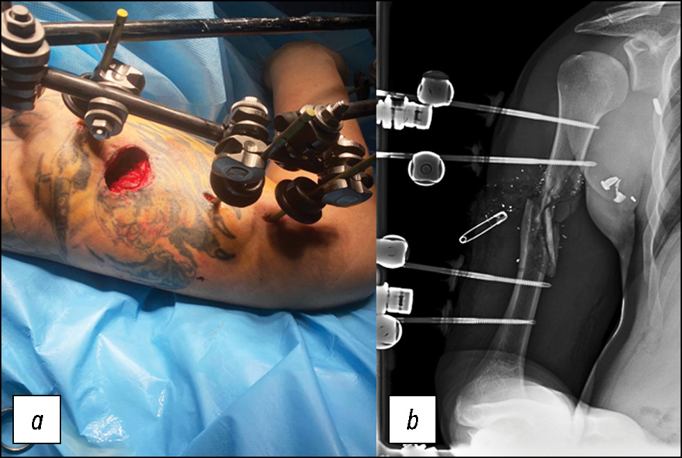 Fig. 3. Patient 1: a, the patient with an external fixation device in a “pelvis–femur” configuration; through-and-through shrapnel wound of the proximal left femur with destruction of the greater trochanter and a displaced intertrochanteric fracture; b, radiograph after the first stage: stabilization of the injured limb using external fixation.